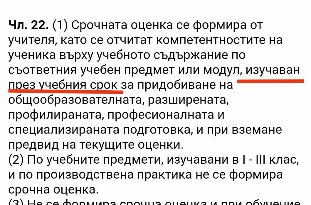 Срочната оценка се базира на оценки, поставени върху материал, изучаван през срока. А не за миналогодишни знания.