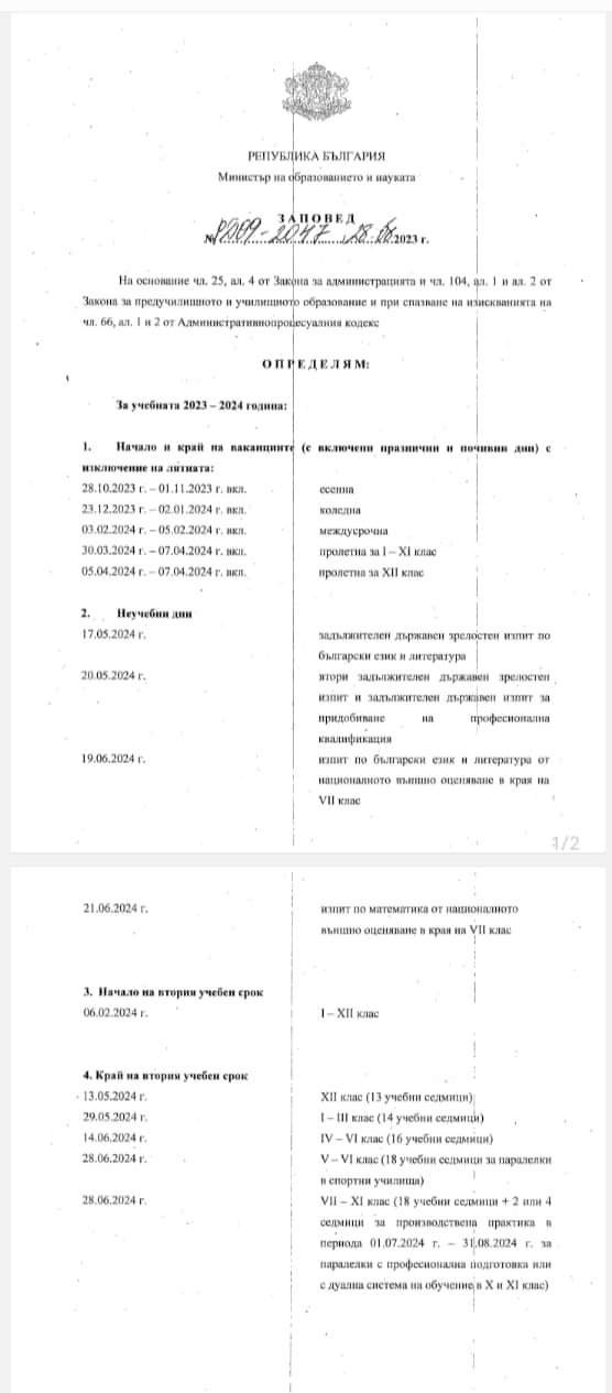 Сутринта през телефона мярнах снимки на заповедта в някоя от ФБ групите за образование. Вероятно от МОН съвсем скоро ще я качат на сайта.