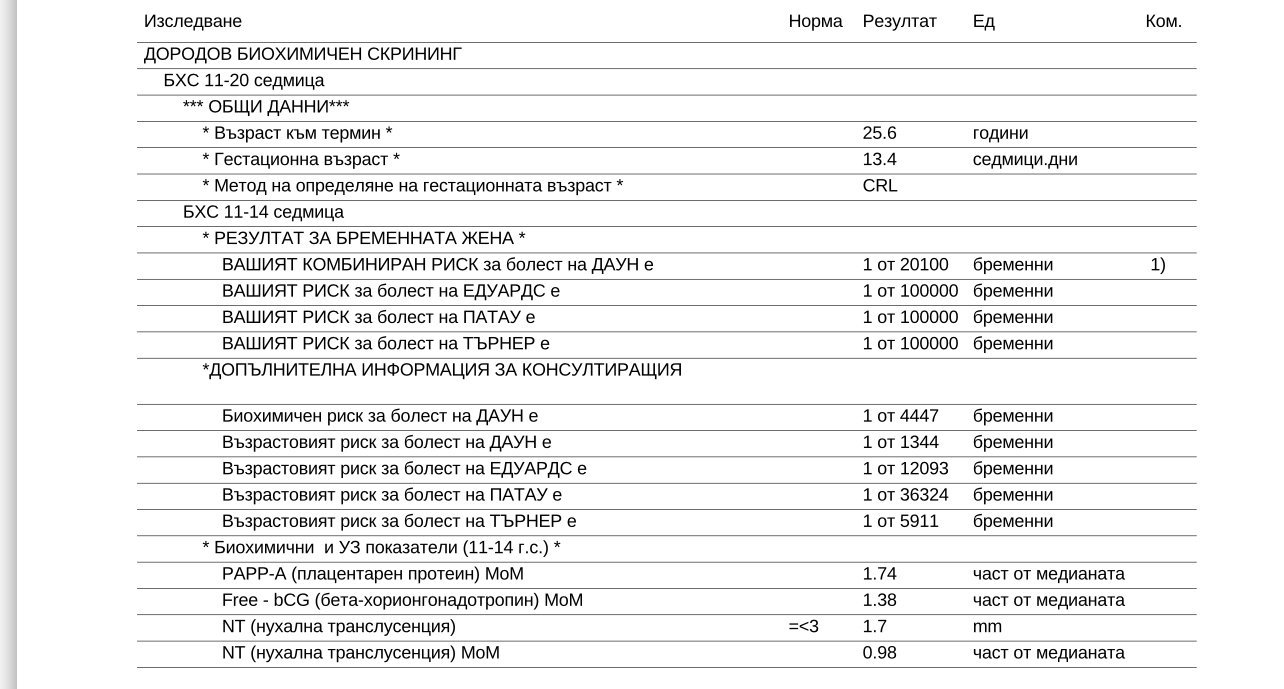 При мен чак сега излязоха резултатите от БХС (ФМ ми беше в сряда), рискът ми според възрастта е 1:312, а комбинираният според биохимията и ФМ е 1:902. Не съм имала възможност все още да ги коментирам с Атанасова.