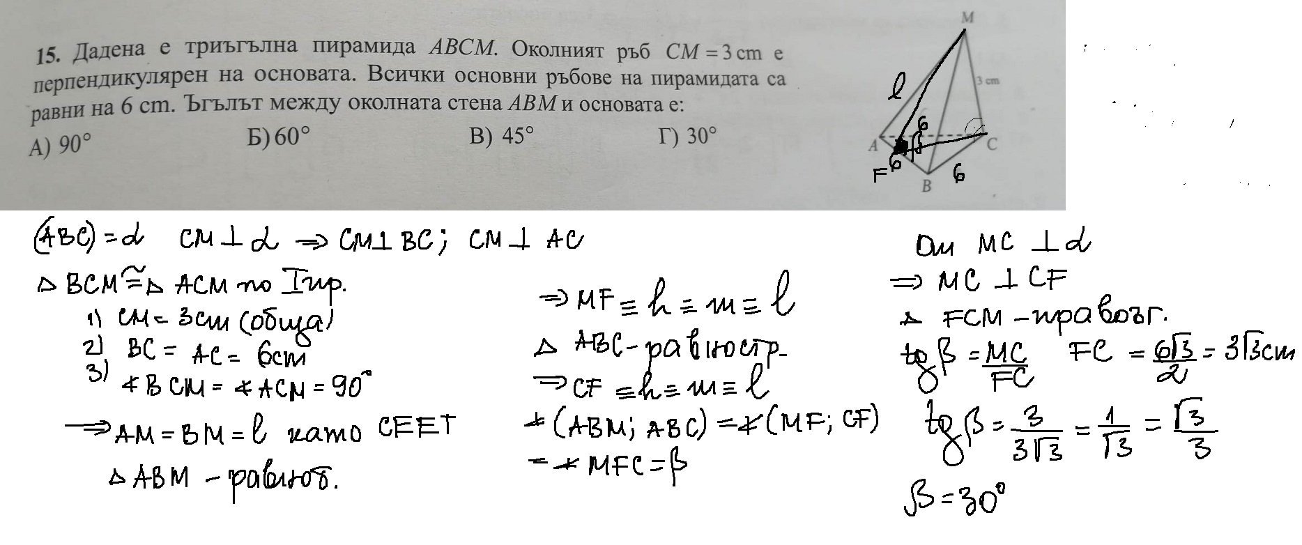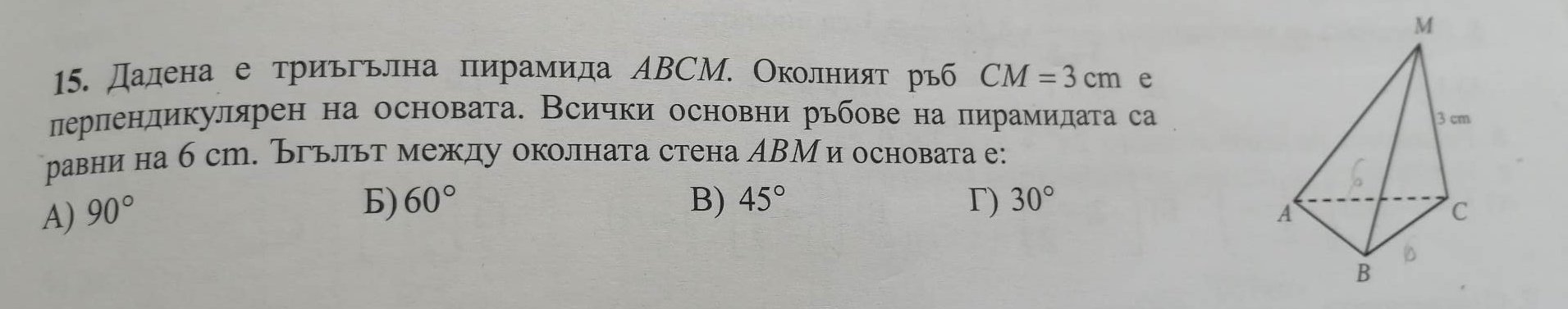 BM не ви трябва. tg на търсения ъгъл е СМ/височината в основата = 3/3 корен 3 или ъгълът е 30. (редактирам си техническата грешка)