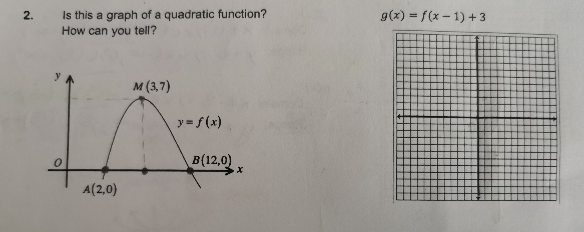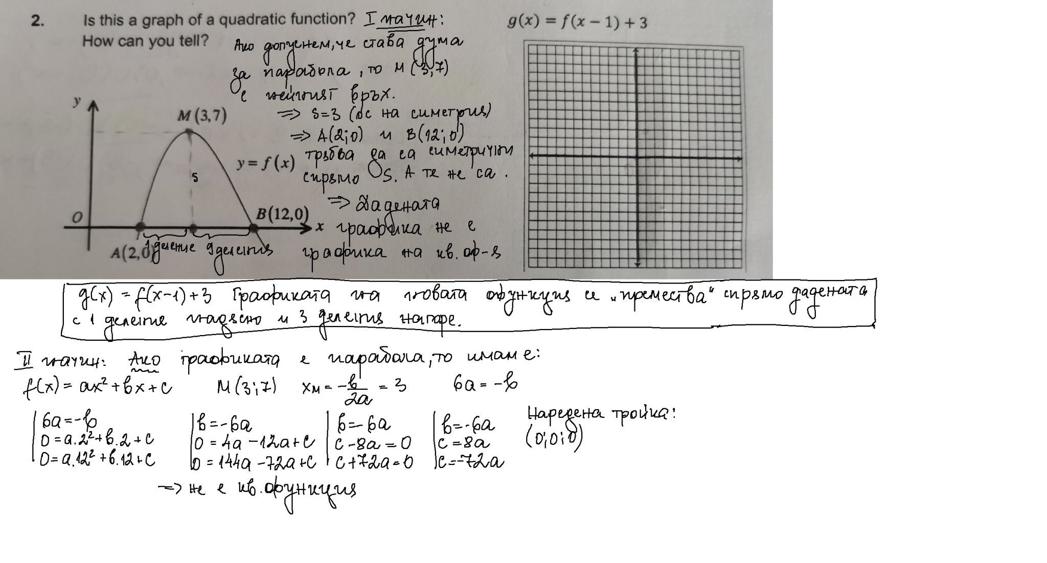 Нулира се в двете точки при х=2 и х=12, но не е симетрична. Да сметне а от точката (3;7)