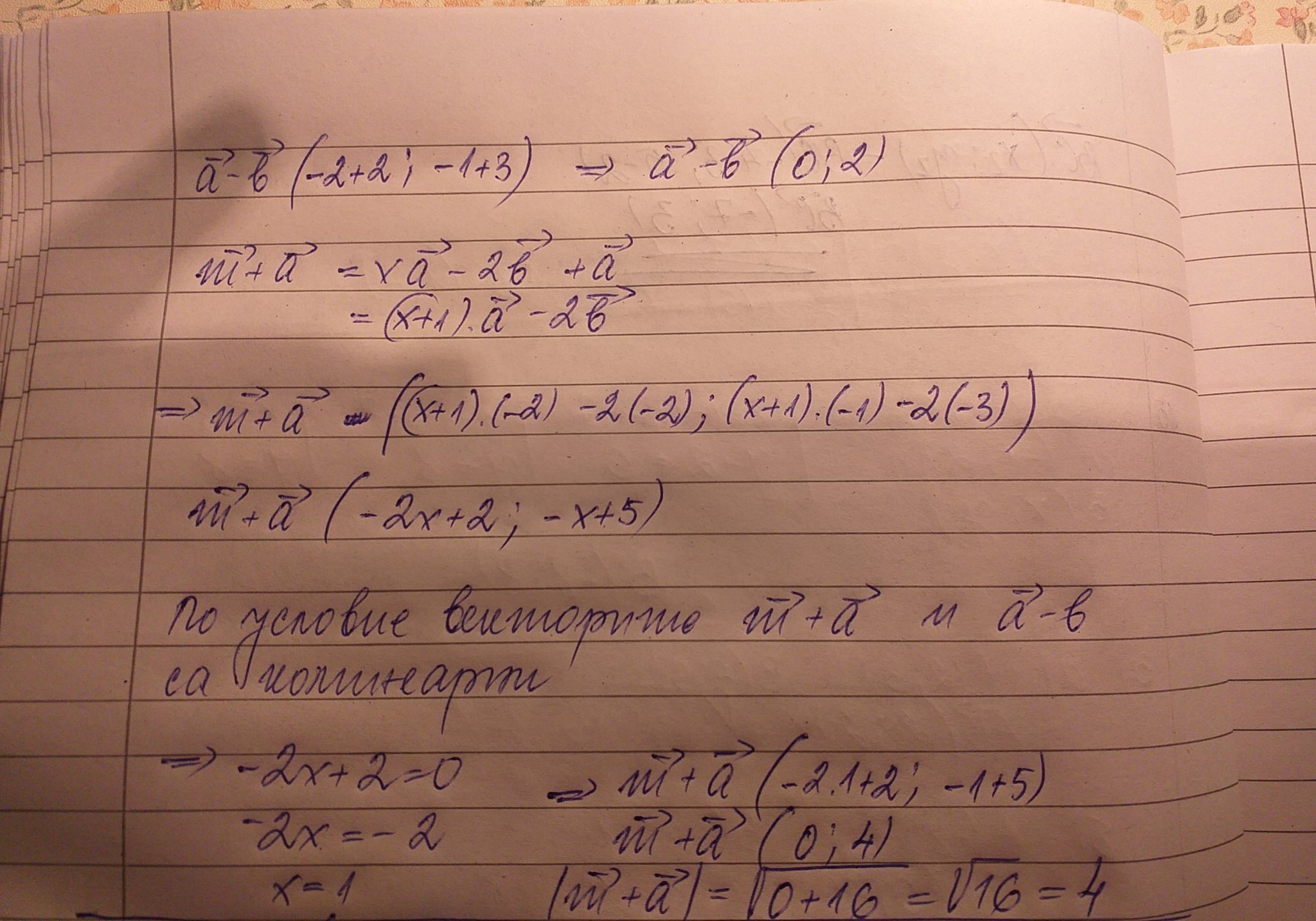 Дадени са векторите а(-2,-1) и b(-2,-3) и вектор m=xa-2b. Ако векторите  m+a и a-b са колинерани, намерете дължината на m+a.