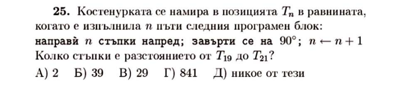 Тогава, триъгълникът Т19Т20Т21 е правоъгълен, с катети Т19Т20 = 20 стъпки и Т20Т21 = 21 стъпки и от Питагоровата теорема получаваме, че хипотенузата Т19Т21 = 29 стъпки.