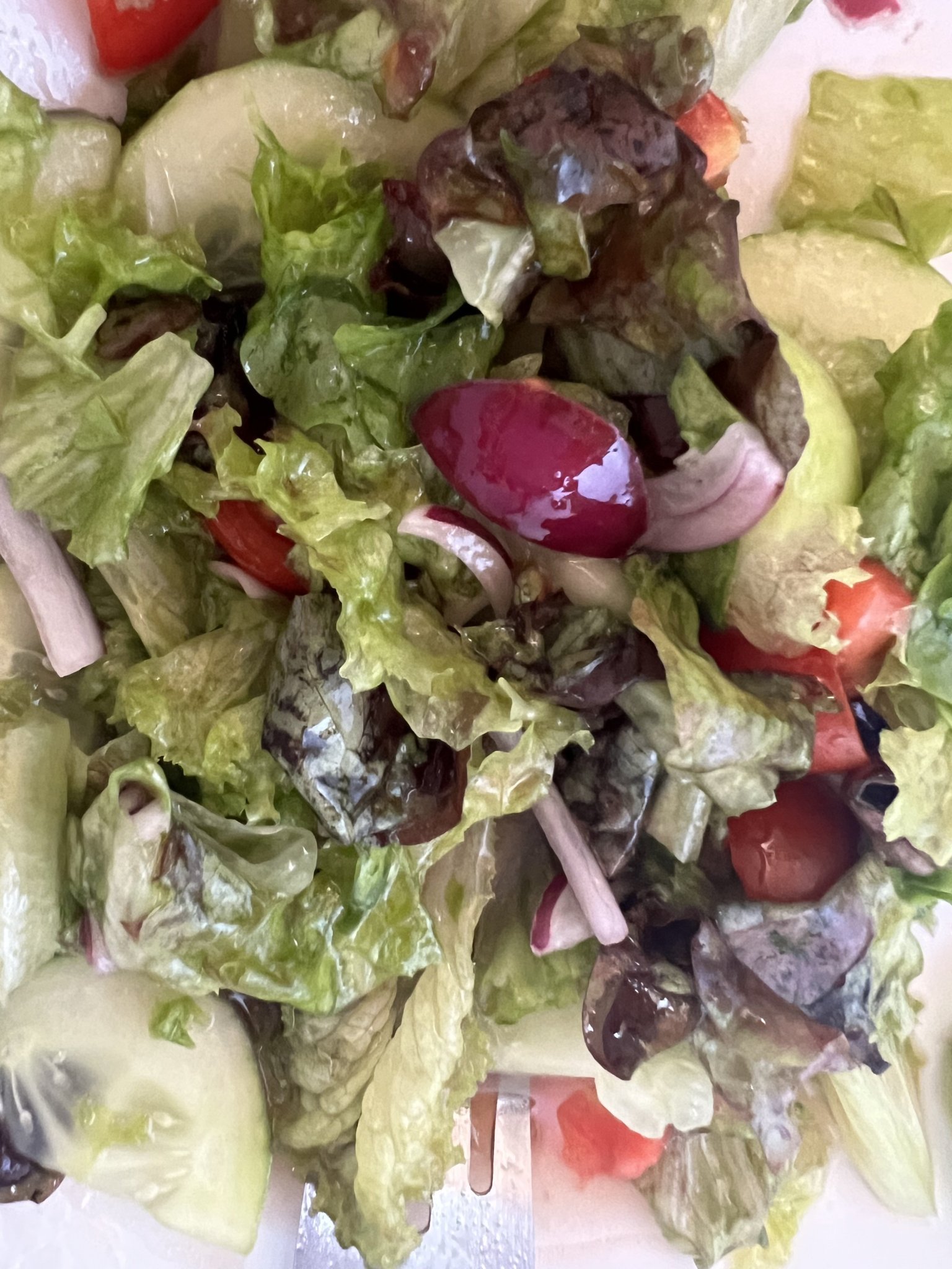 Аз го режех на супер тънки филийки на най-тънкото на мандолината и отиваше в салатата от зеле и моркови. Тя и тая салата им беше откритие де, можело то и без майонези и сладки дресинги от магазина, убиваха се да ядат. Проста салата от зеле и моркови по нашенски - не с разбит дресинг ами сипвам от шишето оцет и пак така зехтин, те такова чудо не бяха виждали Joy Листа от нашенската целина обичам в такава салата, ама там като нямаше...