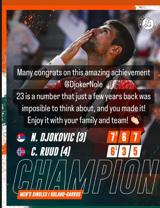 Титан! Велик! Гений! Единствен! Колос! Ненадминат! Честит 23 рекорден шлем на Новак и на всички, които го подкрепят. Много е хубаво да си фен на победителя! И да си е наш човек! Направи го! Ура!  Голям турнир се получи! Новак отново намери отговор и още в 1 сет поведе. Не беше лесно начало, нито мач, нищо, че беше в 3 сета. Всъщност не се наложи да играе 5 сета на този РГ. Новак умее да играе победоносно срещу всеки тип играч. Това е невероятно! Млади, ниски, високи, спринтьори, силови, виртуозни....няма значение. Изключително много ми хареса Рууд. Страхотен е! Игра чисто, държа се приятелски, почтително, бори се докрай. И аз като Новак му пожелавам шлем, при условие , че Новак не е на финал.