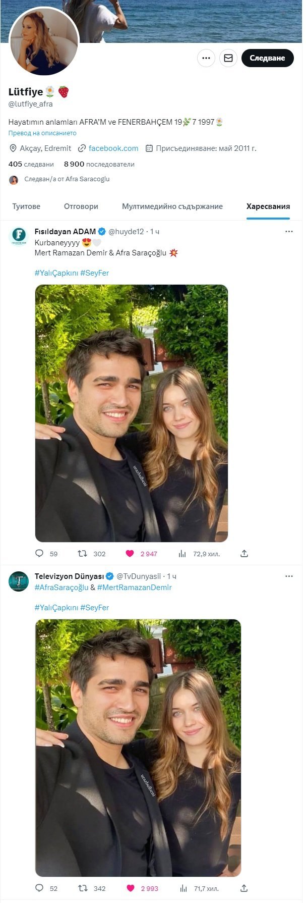 Аз все още не мога да разбера каква е тази драма за снощното парти.   Не съм съгласна, че актьорите трябва да се държат така , както на нас зрителите ни се харесва. Освен това зрителите нямаме угода, все за нещо мрънкаме. И за Серенай и Бурак не съм съгласна, че са опазили Мерт. Напротив , възползваха се от нарастващата популярност на Мерт и Рибарчето. Ролята на Мерт в Шахмаран беше такава, че спокойно можеше да мине и без него, но  те хитро използваха ситуацията. Колкото до папараците, те са свикнали на всякакво отношение от звездите, едва ли им е такава драма подминаването на Мерт, каквато се оказа за нас, драгия зрител.