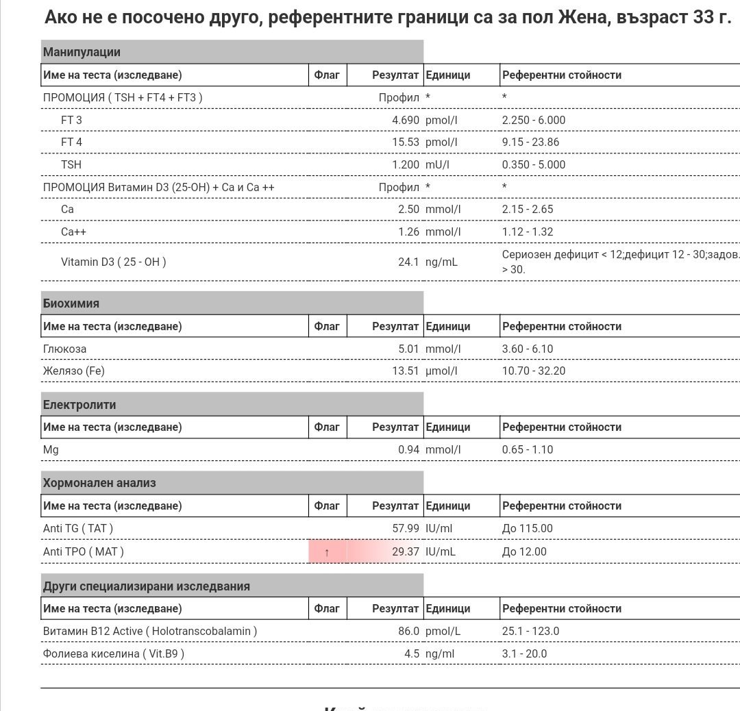 Здравей, mibobo. От четири пет дни не се чувствам добре, спря ми апетита нищо не съм яла от тогава, получавам паник атаки, не мога да спя. С хиперфунция съм на щитовидната жлеза, но преди 2 месеца доктора ми спря метизола. Добри ми бяха изследванията. Вчера реших да ги проверя и се оказа, че пак се връщам на метизола. Дали тези паник атаки и безапетитие са от това, че не са наред хормоните? Къде да търся причината? Не мога повече да издържам. Какво да пия. Дайте ми моля ви се съвет. Роди ми се преди една седмица внуче и явно от напрежение ли се получи от щитовидната ли е незнам накъде да тръгна. Вместо да се радвам аз легнах болна. Ето това са изследванията.
