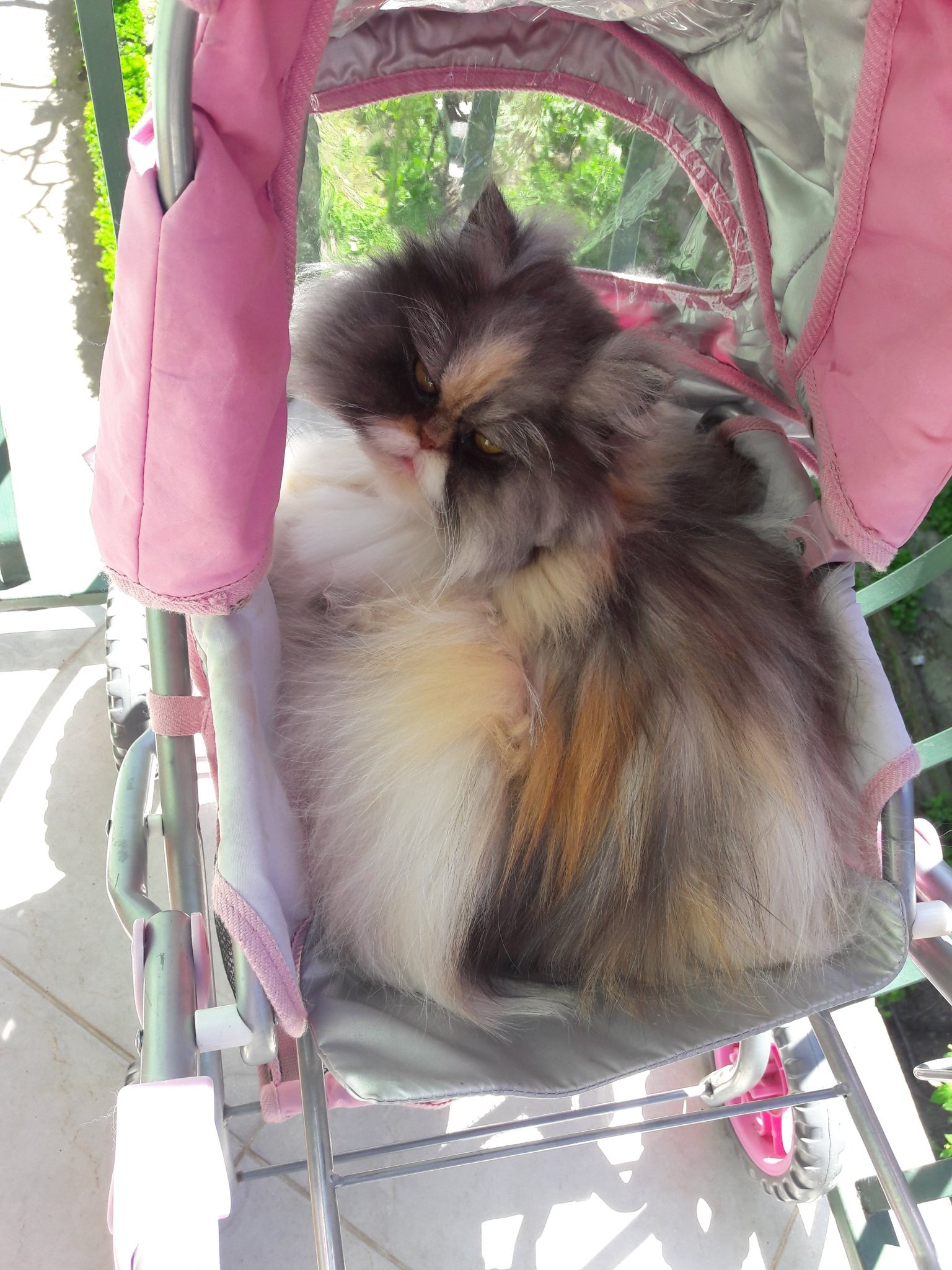 Едната ни дългокосместа е с лятна прическа, подстригана преди месец. Първо заради жегата,  много гъста козинката и второ, защото повръща въпреки храната п/в космени топки.