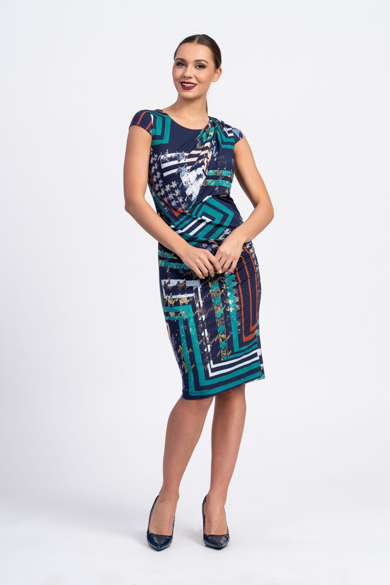 По-искрено - комбинацията от цветове в десена на роклята е кажи речи единственият и позитив. Нито за офис става (твърде шарена), нито за свободно време. Дължината и съсипва дори красиви колене