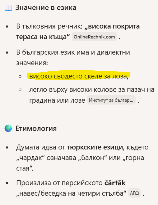 Точно преди време се чудех дали лятото като упътвах една жена коя е търсената от нея къща казах:оная с чардачето,а то съм я използвала с персийското значение на думата навес.
