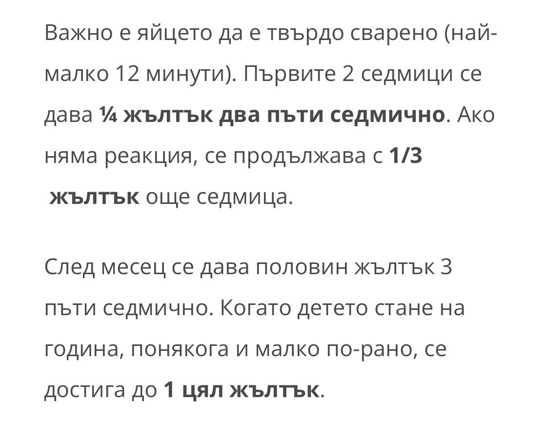 Аз до скоро давах половин жълтък, но от около 1 седмица давам цяло яйце. Правя мъфини, кексчета, закуска авокадо с яйце на филийка за сега.