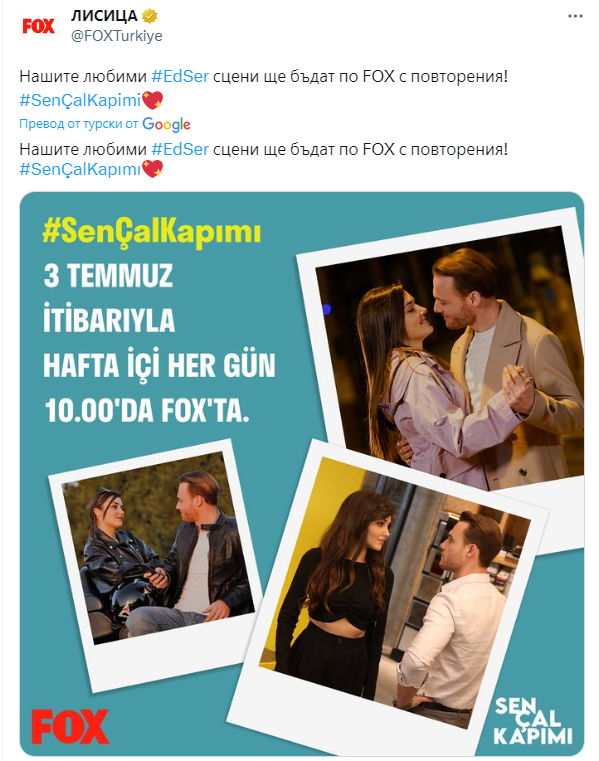 "Нашите любими #EdSer сцени ще бъдат по FOX с повторения! 💖 #SenÇalKapimi