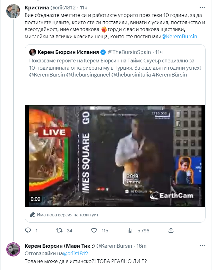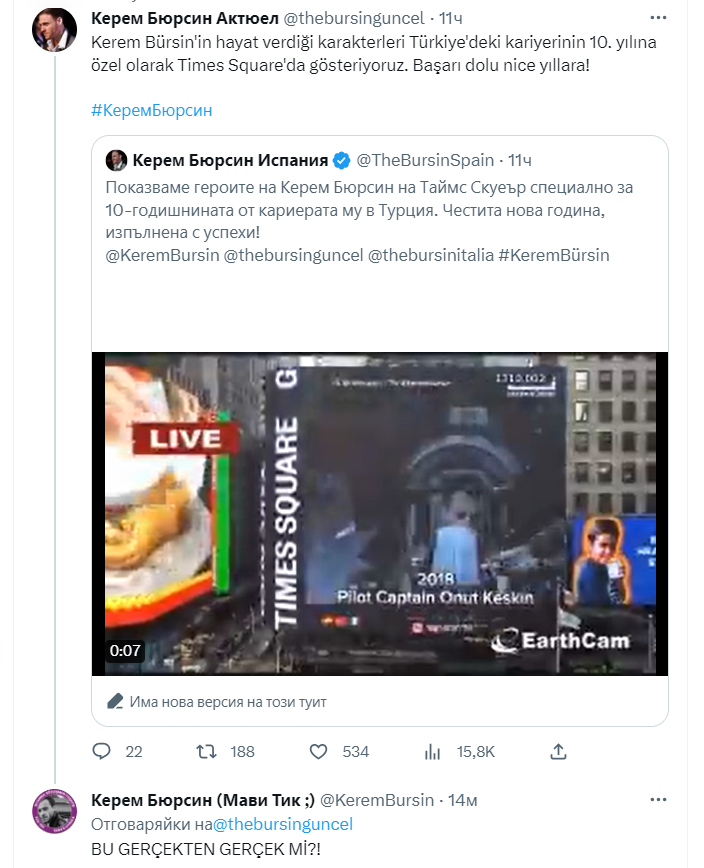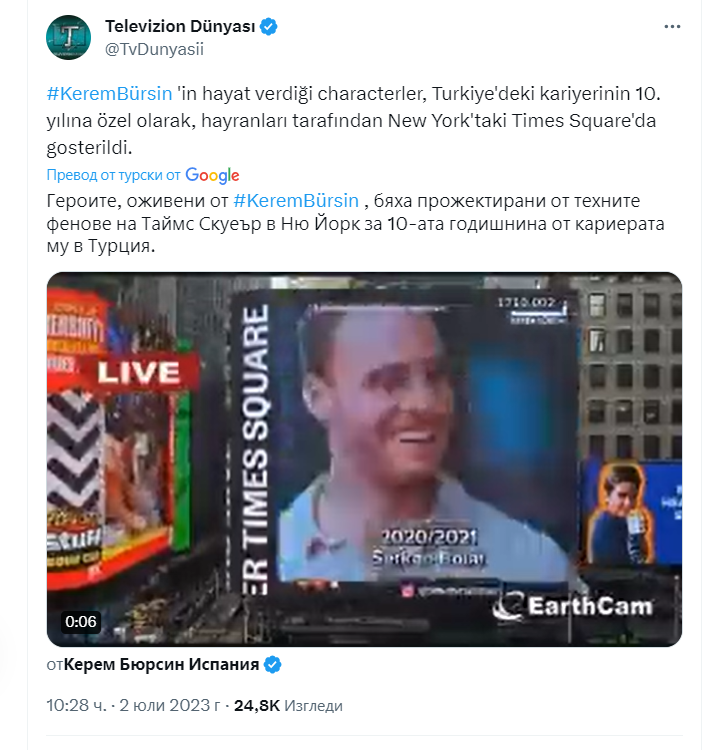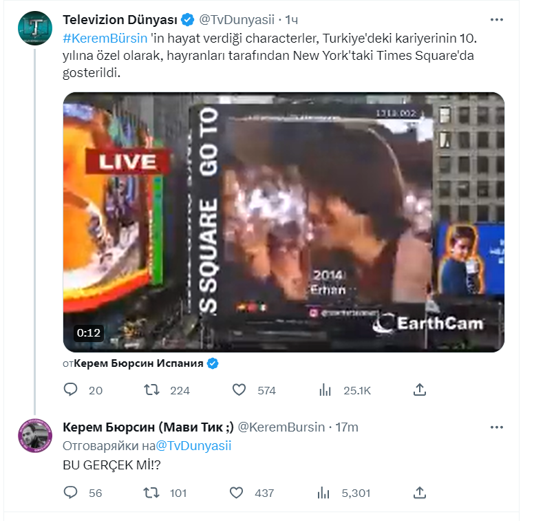 "Показваме героите на Керем Бюрсин на Таймс Скуеър специално за 10-годишнината от кариерата му в Турция.