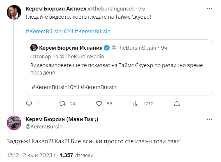 Днес от 16 часа бг. време ще има хаштаг, с който ще се отпразнува 10 години от началото на кариерата на Керем Бюрсин. ( Тъкмо ще видим как е с новите правила на Мъск)