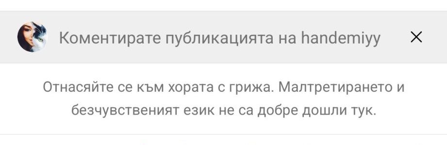 Феновете забелязаха нещо ново в инстаграма на Ханде. Когато опитам да коментирам някоя нейна публикация излиза автоматично този надпис. Не ме спира да пиша, просто предупреждава.