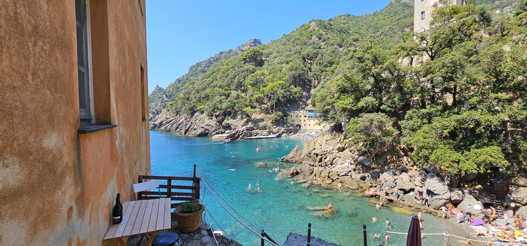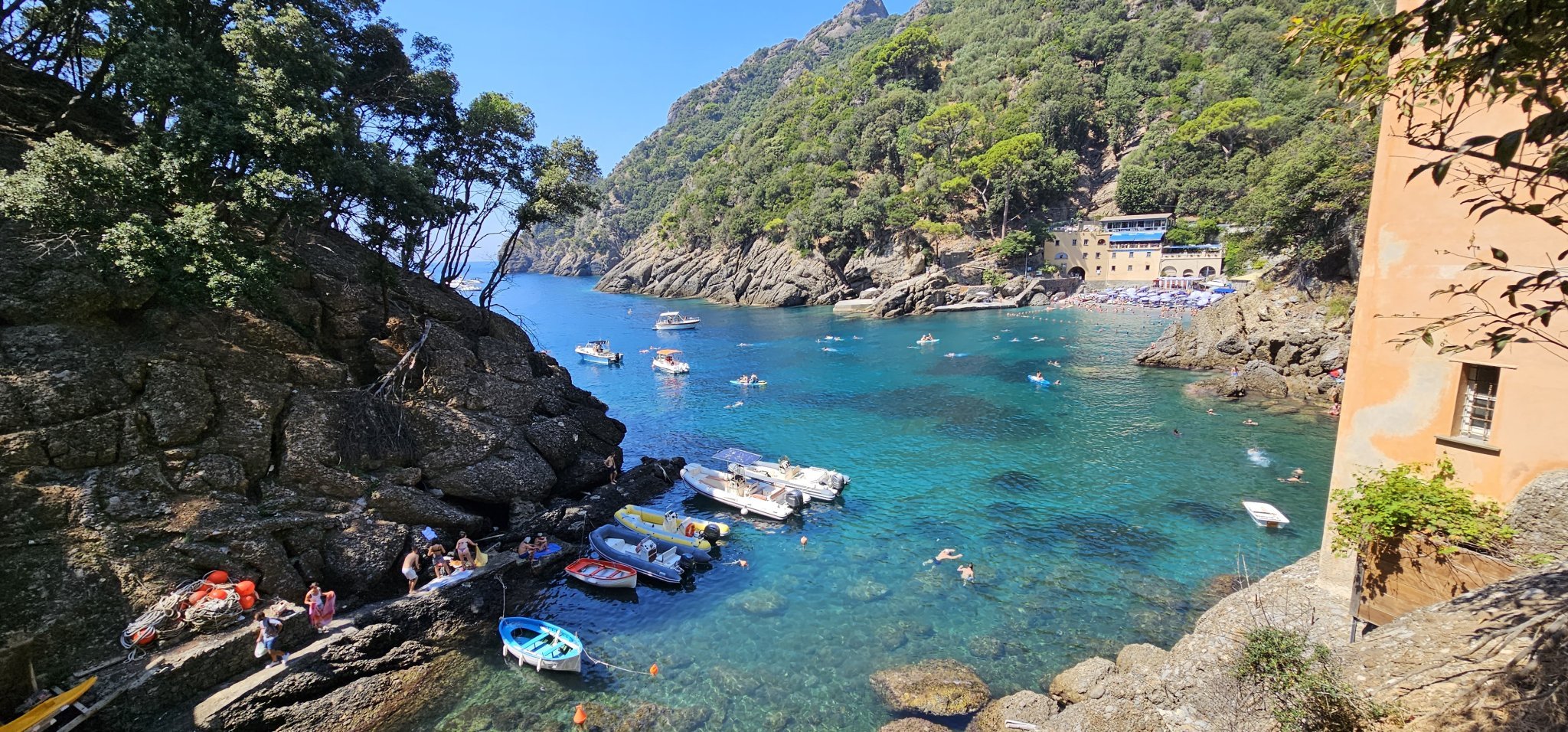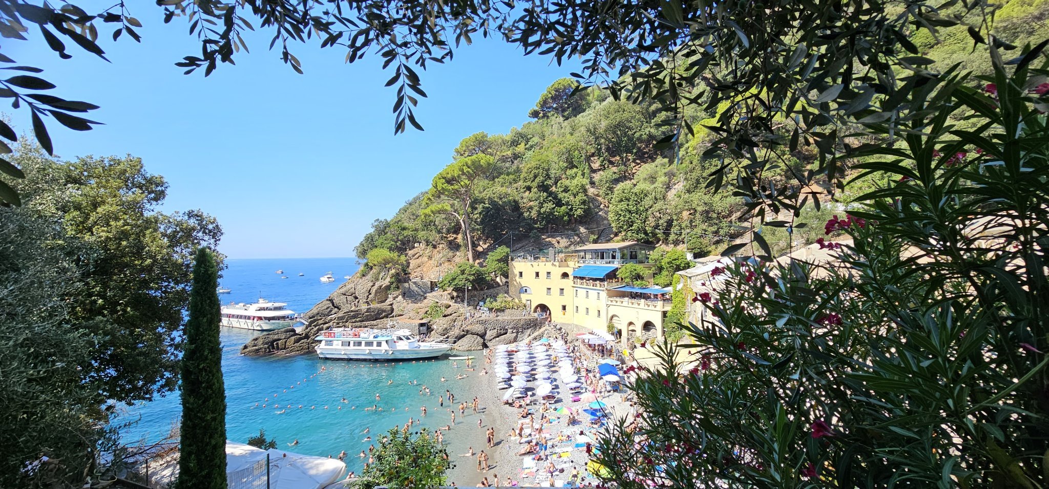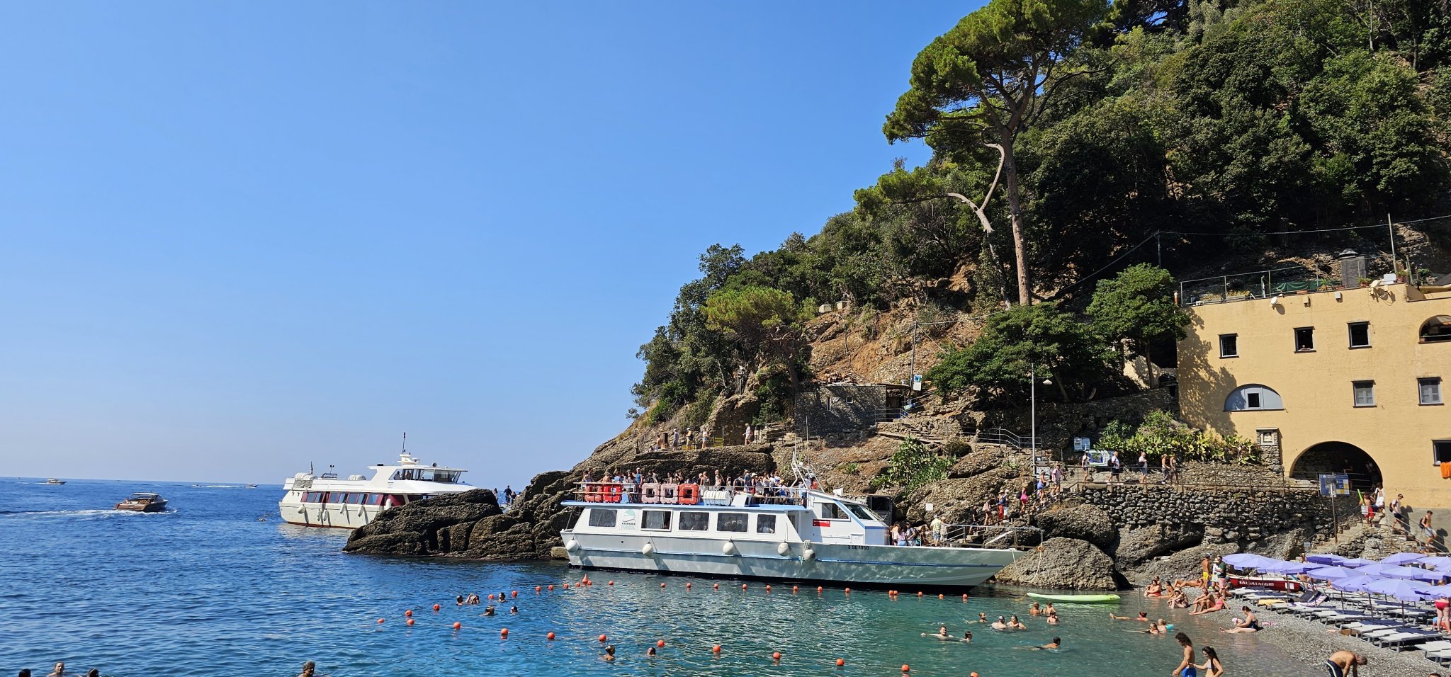С ферибот тръгнахме от Рапало до Сан Фрутуозо в 10 часа(втори час за деня, първи в 9 часа), беше спокойно и не много претъпкано. Сан Фрутуозо е магично малко заливче, мислихме само 30 минути да сме там и да потеглим за Портофино. Но реално толкова много ни хареса: звукът на цикадите, кристалните води, сянката на боровете, решихме да обядваме там, трудно намерихме места, бяха резервирани повечето, цените бяха по-скъпи от средното, но беше прекрасно. Докато чакахме за маса, едната ми приятелка се изкъпа в залива, беше подготвена с бански и каза, че е било божествено. Останалите топнахме само крачета. 😊 Препоръчвам горещо да стигнете до там.