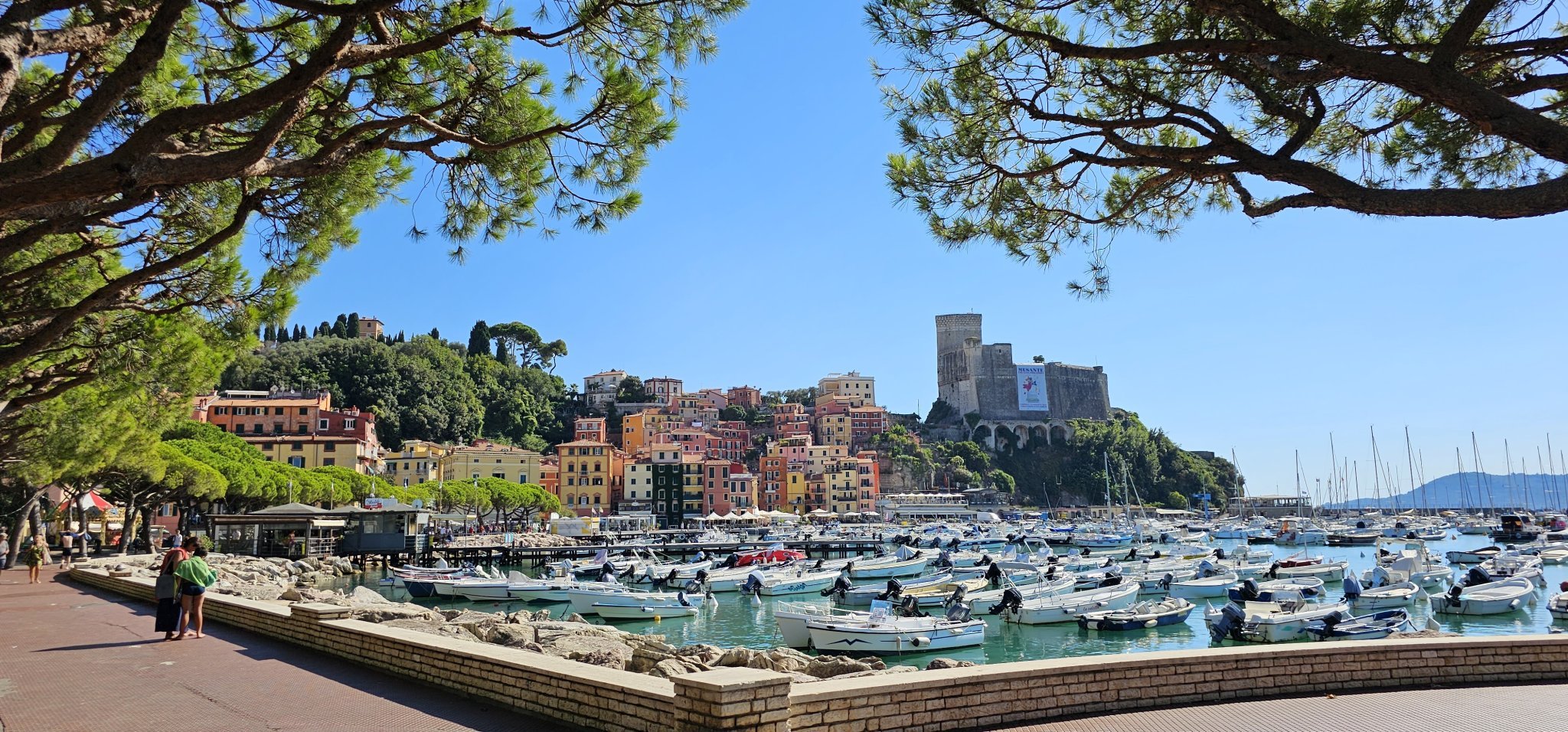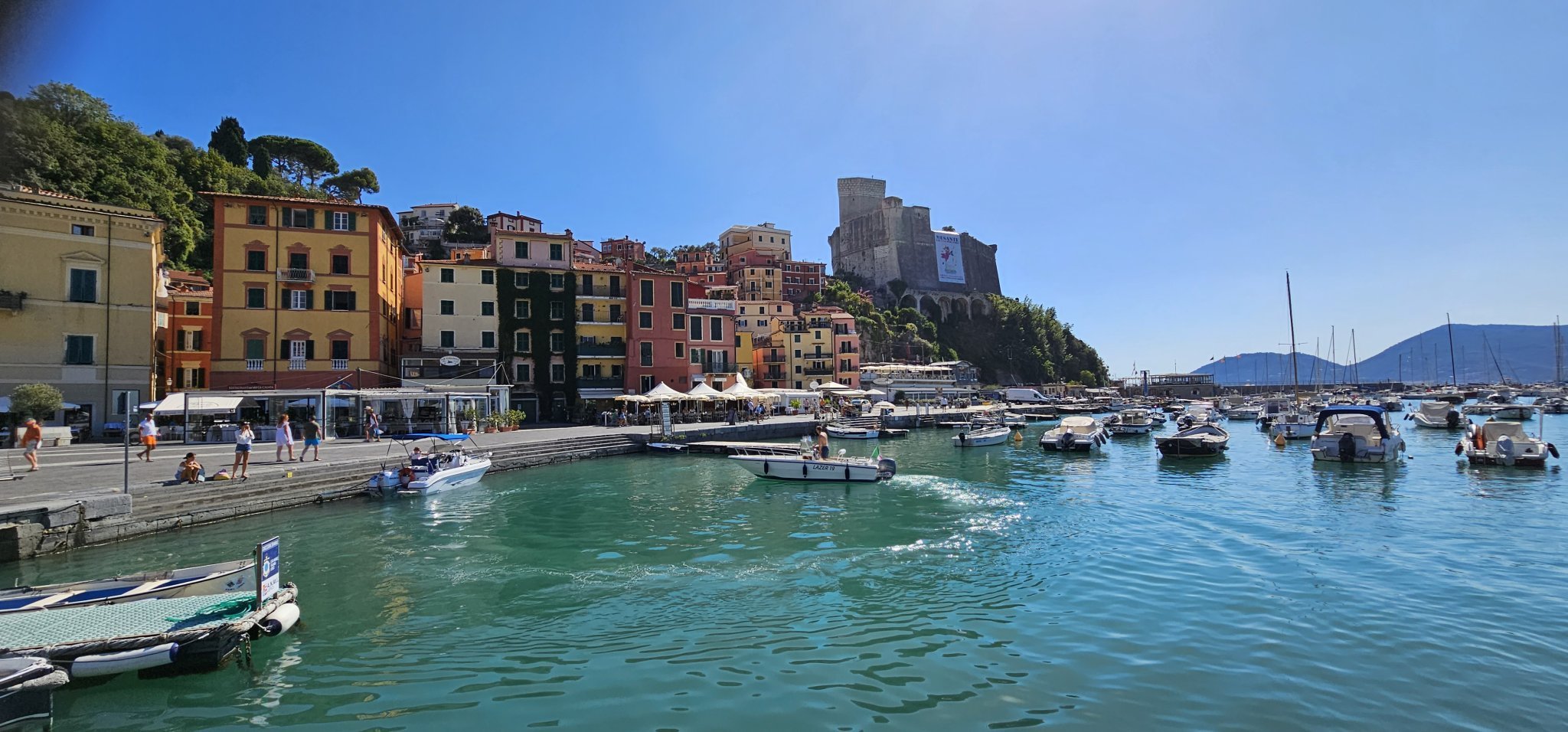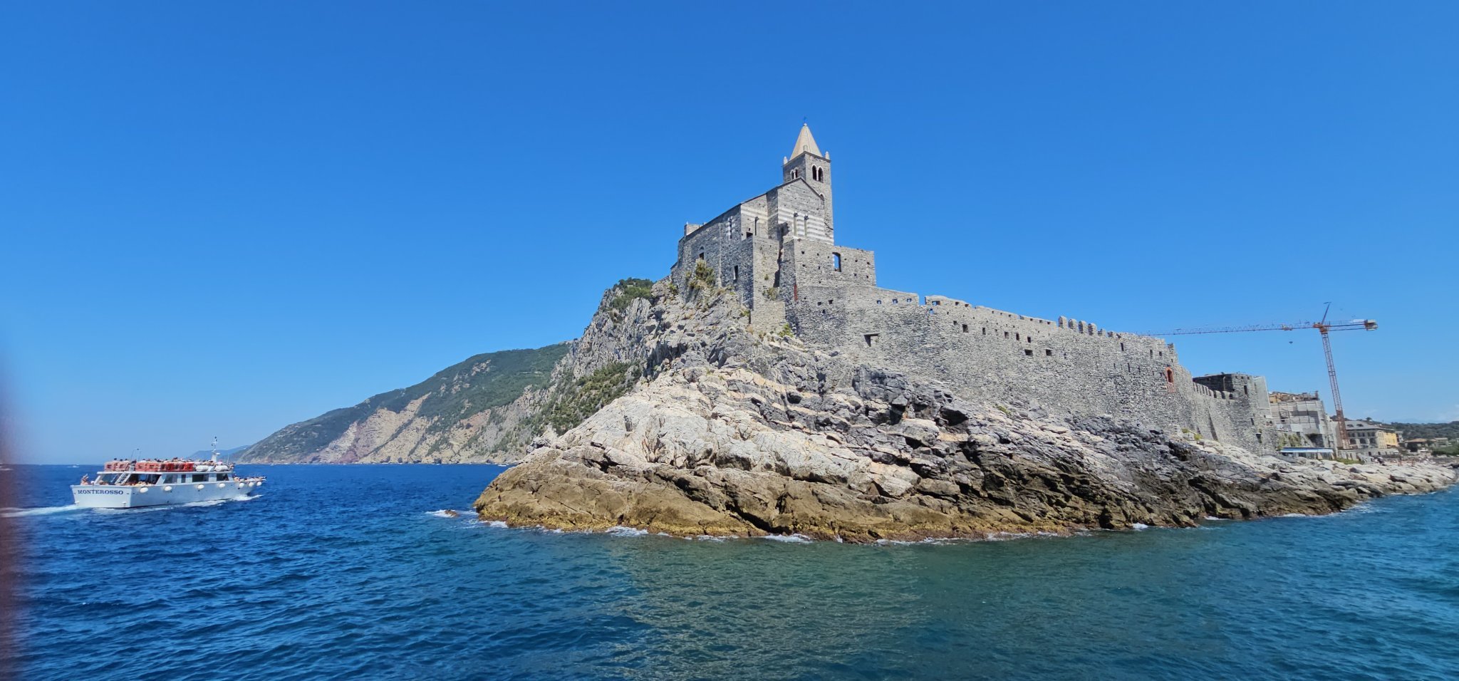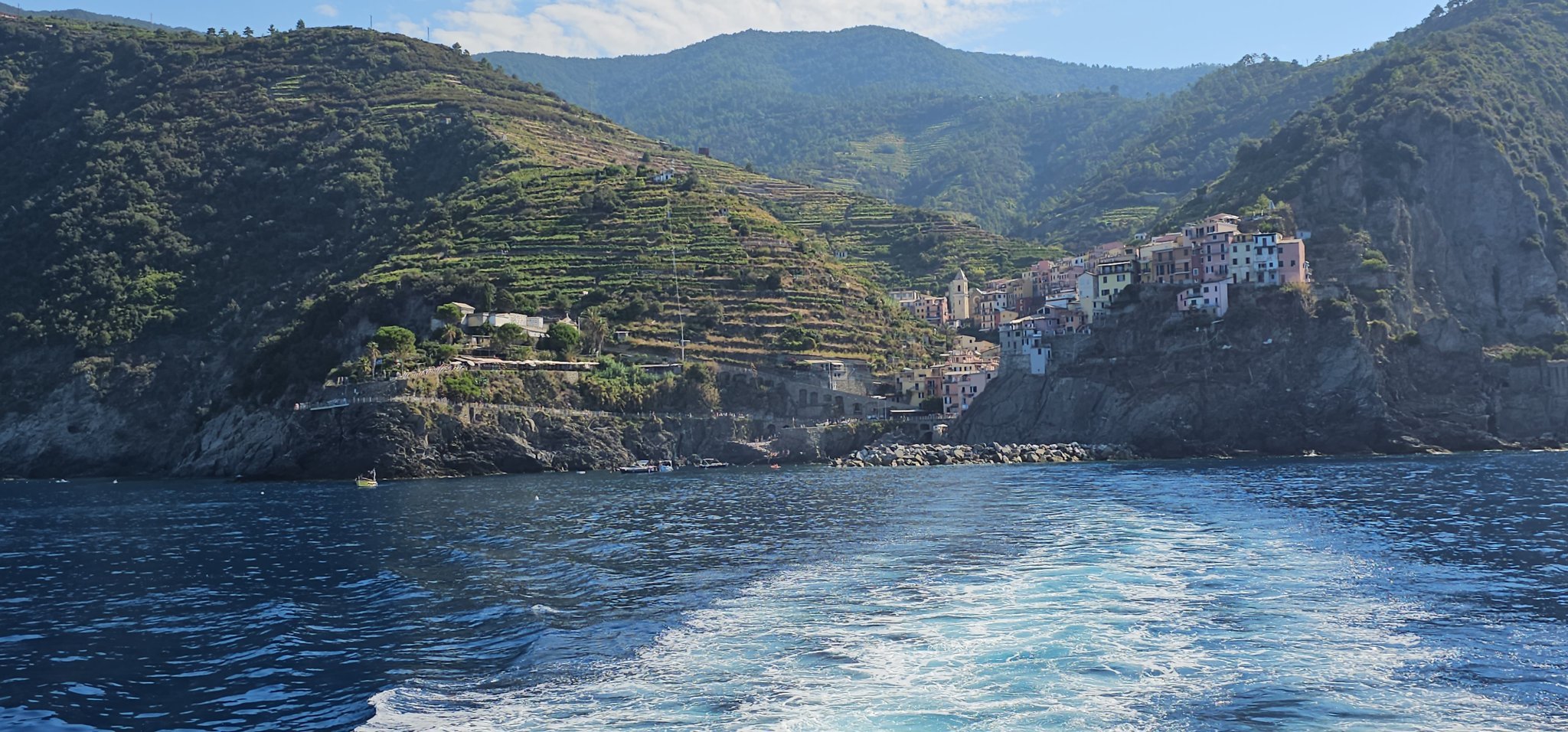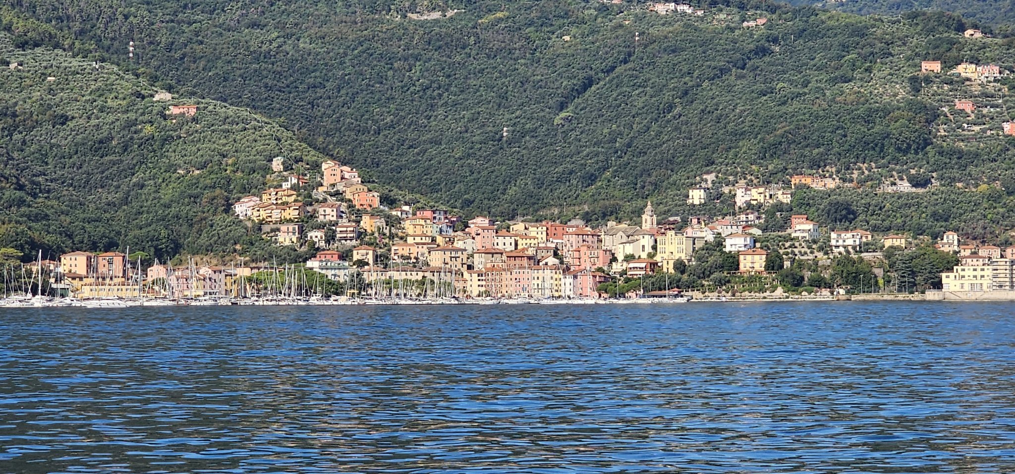 Ден втори: С ферибот потеглихме към последното селце от всичките пет, които са част от крайбрежната област Чинкуе Тере, Монтеросо ал Маре. Хубаво е да сте доста по-рано за качване, първият ферибот в 9.00 часа беше препълнен и всички бяха заели места в 8.50 часа. Гледките са много красиви и така виждате всяко селце от водата, има спирка на всяко, което е много красиво като изживяване. Самото пътуване е живописно, много си заслужава. Гледка при потеглянето от Ла Специя: