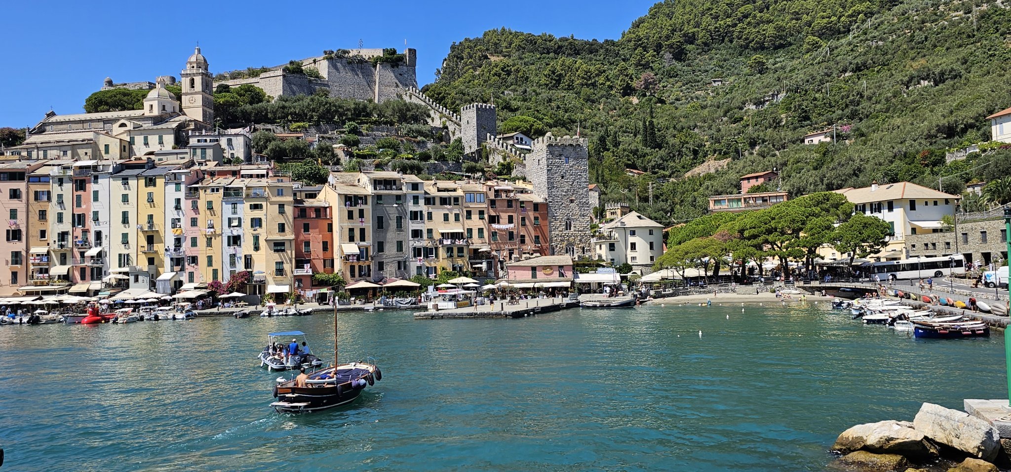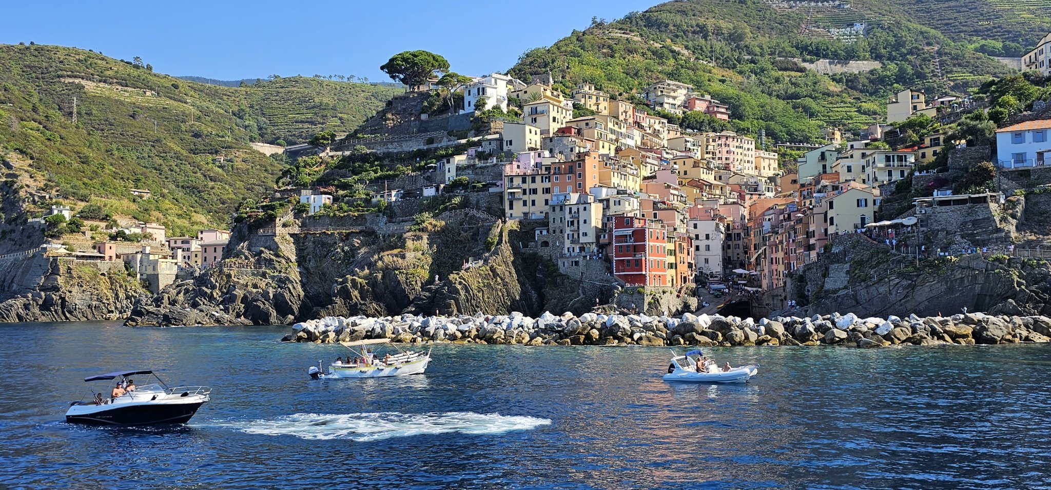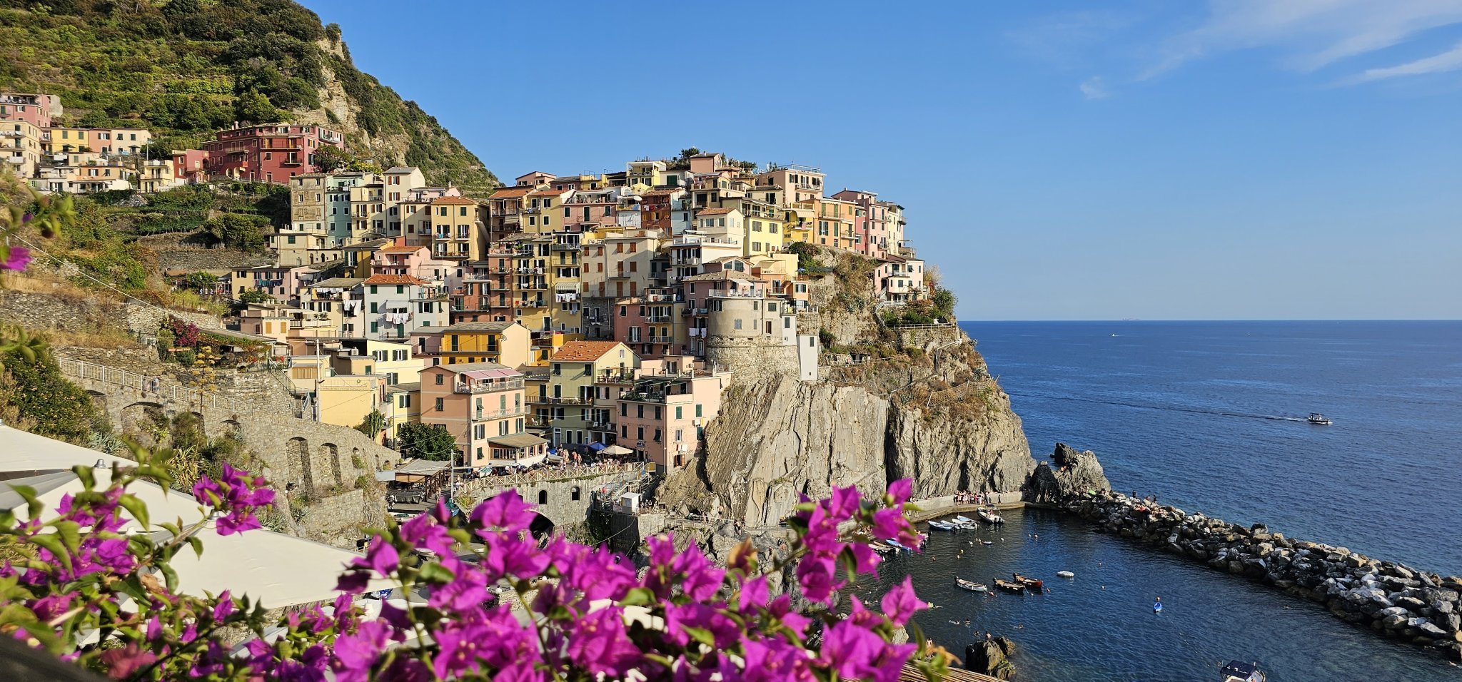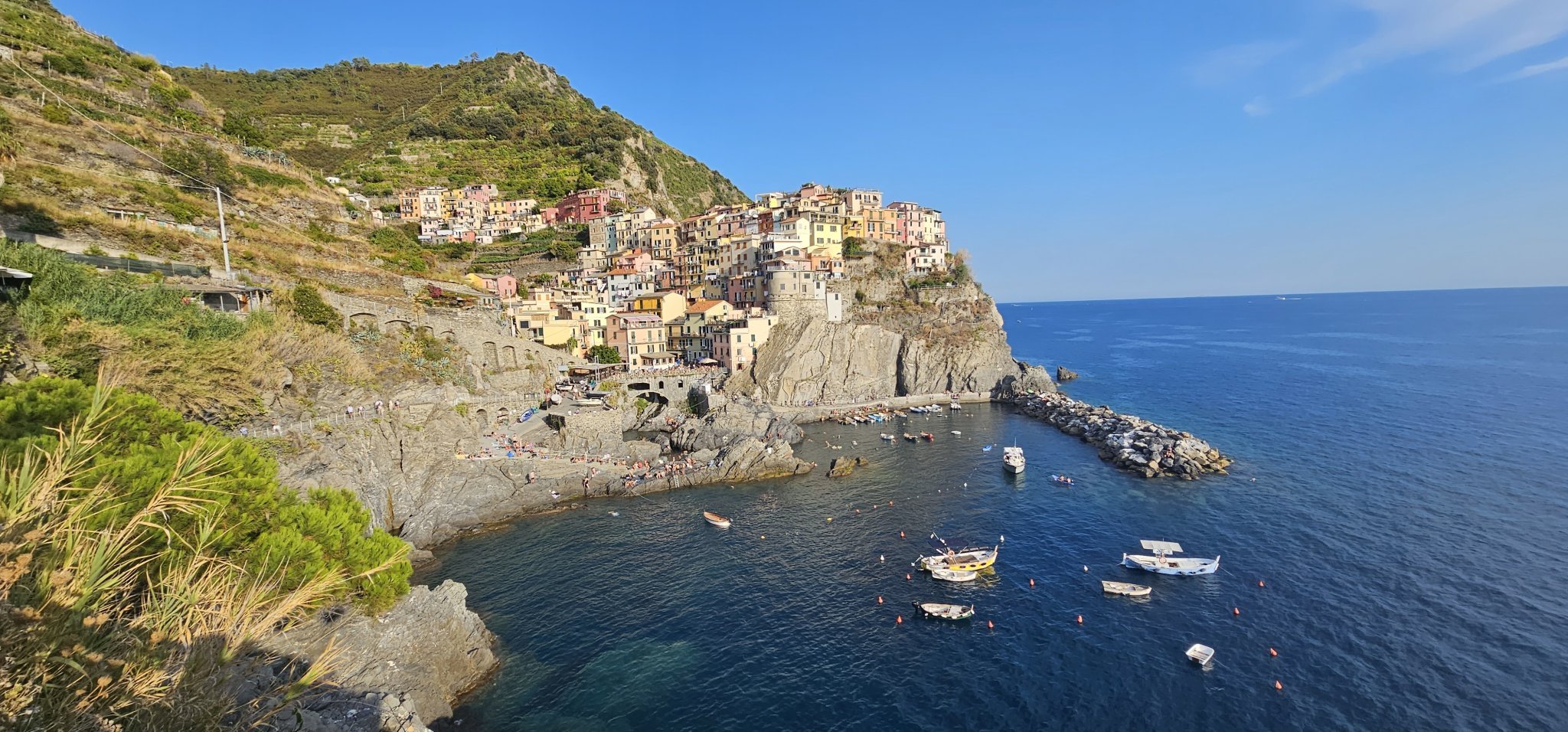 Ден втори: С ферибот потеглихме към последното селце от всичките пет, които са част от крайбрежната област Чинкуе Тере, Монтеросо ал Маре. Хубаво е да сте доста по-рано за качване, първият ферибот в 9.00 часа беше препълнен и всички бяха заели места в 8.50 часа. Гледките са много красиви и така виждате всяко селце от водата, има спирка на всяко, което е много красиво като изживяване. Самото пътуване е живописно, много си заслужава. Гледка при потеглянето от Ла Специя: