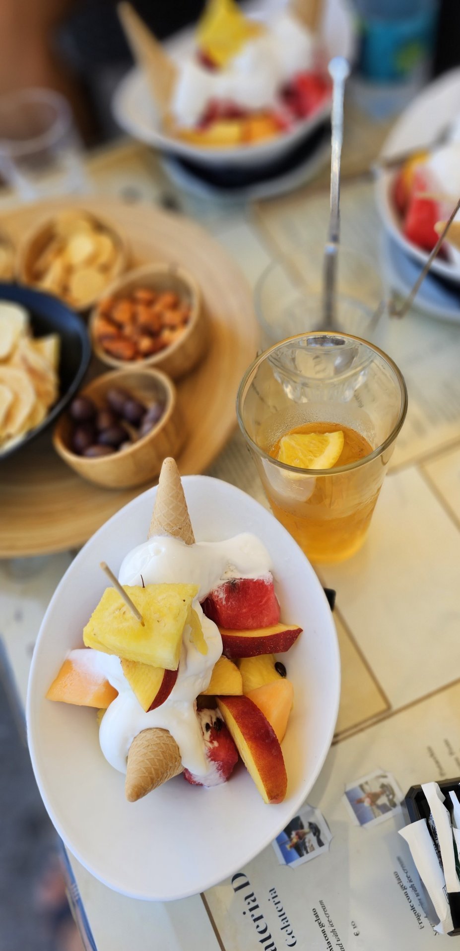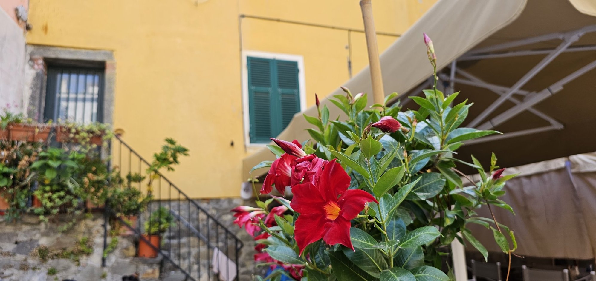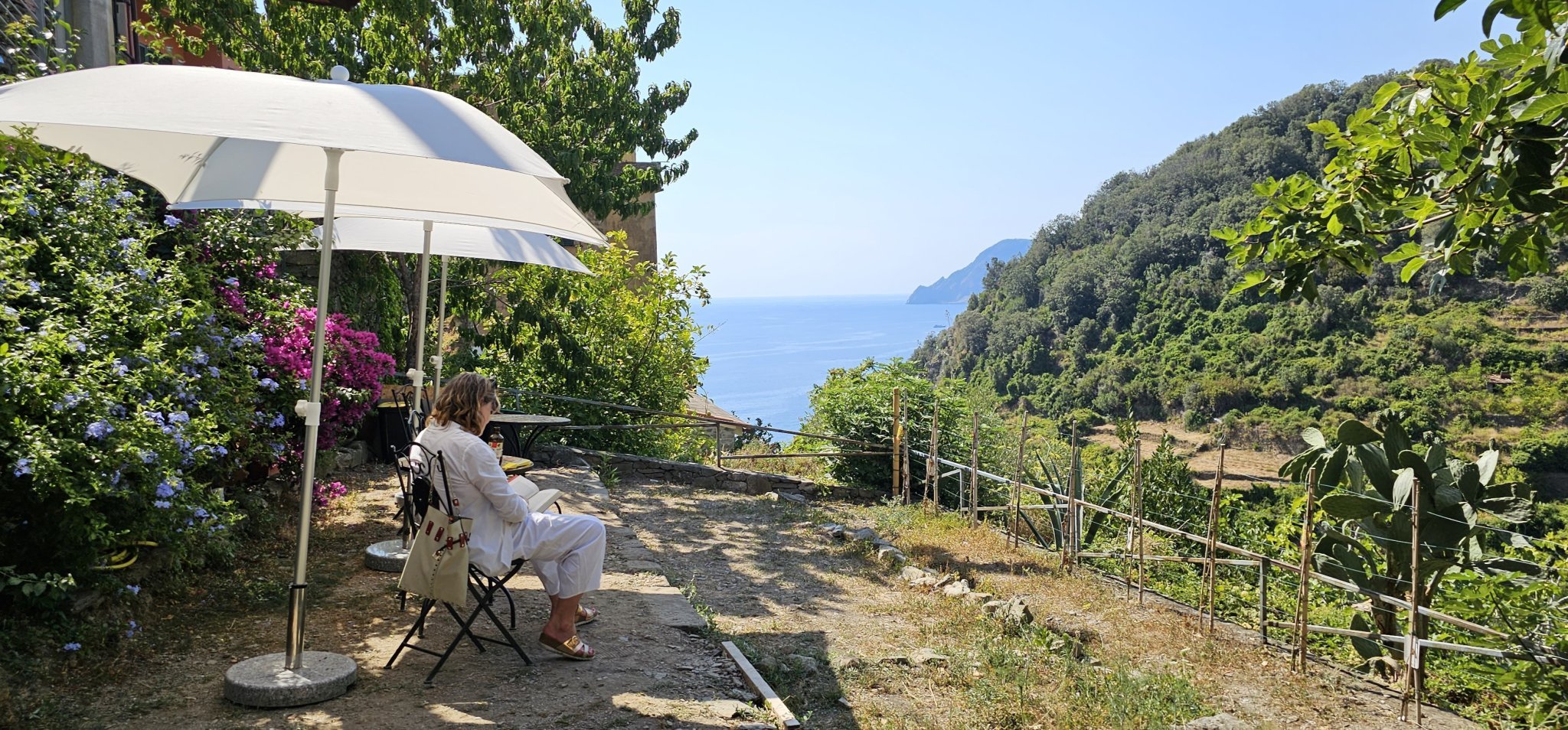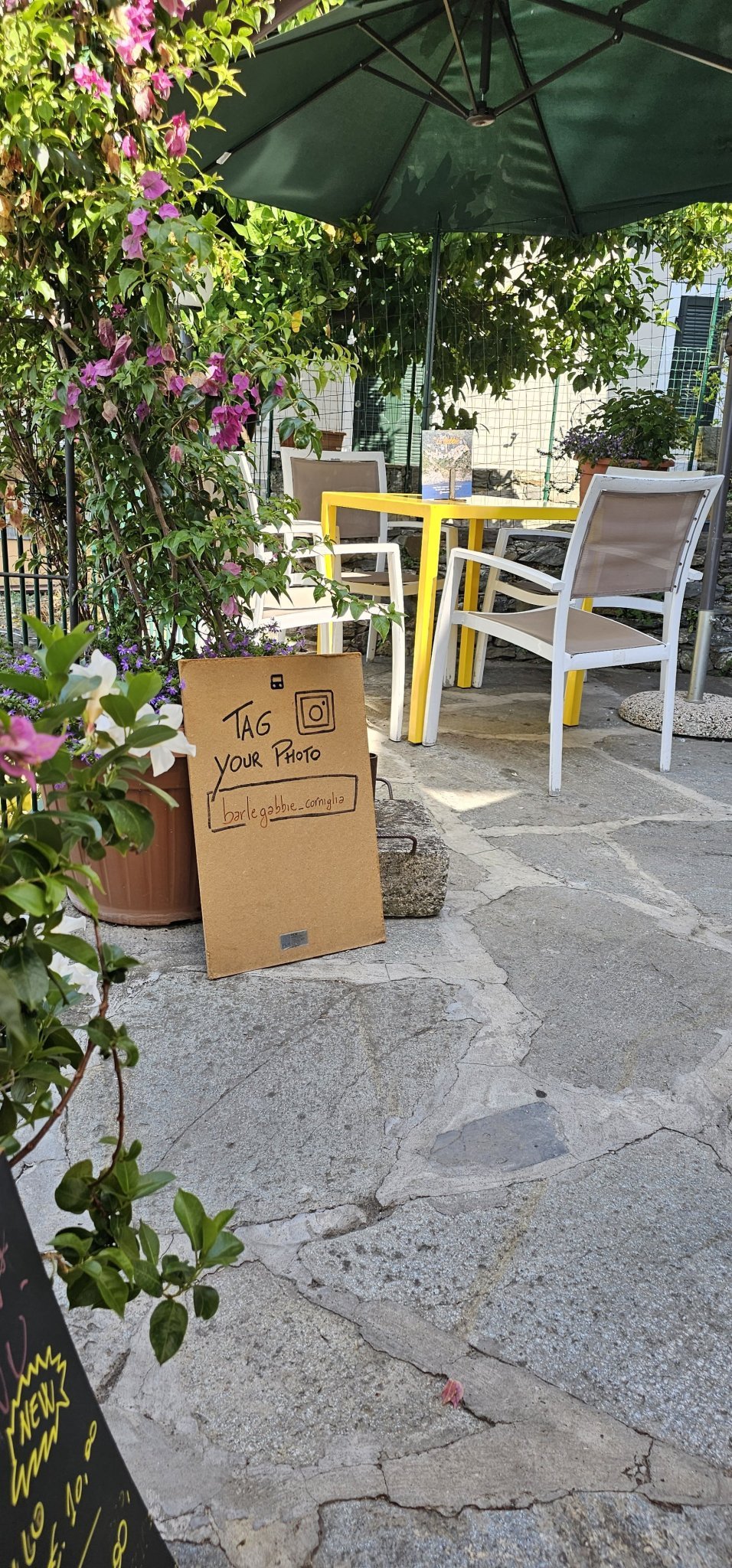 За щастие ни посрещна спокойствието на Корнилия. Ние си бяхме купили Чинкуе Тере карта за дневно пътуване и в цената влизаше безплатно бусче, което спестява над 300 стълби до селцето. Капацитетът му е малък и трябва веднага да се ориентирате да сте на челни позиции, но след като се качи слиза отново и ако не ви се катерят стълби, опция е(за слизане също). Гарата е до морето, но Корнилия няма излаз на море, а само божествени гледки към него. Седнахме на едно заведение, любезно момче ни уведоми, че имат и тераса с гледка към морето, на същите цени и същото меню, на сянка, ако желаем да се преместим. Та попаднахме в прекрасна малко градинка, чуваха се цикади и дори песен на птички, пълна идилия. Една дама в Монтеросо беше разказала на приятелката ни, че има площадка с красиви гледки тук и по описанието и я намерихме. Тази жена беше решила да заживее в Монтеросо след пенсионирането си и каза, че сега животът и всеки ден е ваканция. Също така искам да споделя, че навсякъде виждах из Лигурия изключително красиви и елегантни по-възрастни дами и много им се възхищавах(някои бяха френскоговорещи и туристи). Големи, цветни бижута, красиви цветни рокли, стилни прически, много силно впечатление ми правиха.