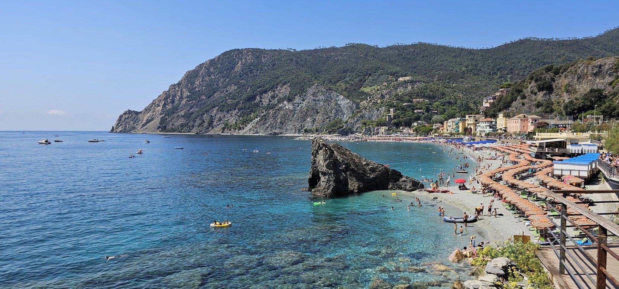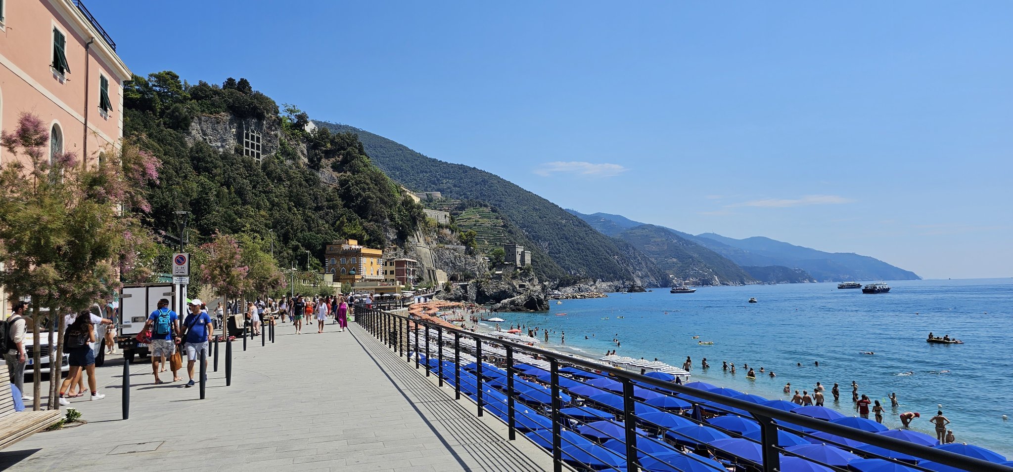 Изключително красиви бяха водите в Монтеросо, просторно, без изкачвания, но беше и изпепеляващо горещо на слънце. Поради тази причина ние си спестихме разходката по цялата слънчева алея до статуята на Нептун. За щастие имаше сянка из красивите улици с магазинчета и заведения. Бързо приготвяха морските дарове в кутийки, имаше макар и малка сянка от млади дръвчета пред тях. Монтеросо ни беше препоръчано като красив завършек на деня със залез и къпане, но уви плановете ни в края на дните все се променяха и не успяхме, но имайте предвид като опция. От там с влак се движихме от село в село, пътуванията бяха от 3 до 8 минути между селцата, ужасна лудница на гарите и във влака, пътувахме до вратата прави, постоянно държахме чантите си, защото блъсканицата беше голяма! Пътува се през тунели, гледки няма. Но предвижването с влак е бързо и не губите време(5 евро еднопосочен билет, около 18 евро дневна карта). Фериботите са през 1 час, може да обикаляте и с тях с билет за round trip на принципа слизане и качване(дневен билет 39 евро), но се ограничавате с ранно тръгване с последния ферибот(18-18.15 часа), влаковете се движат до и малко след 00 часа през 10-15 минути ориентировъчно. Общо взето за мен е добре да се комбинират двата вида транспорт с цел по-добро и пълно изживяване в рамките на един ден. Пълна информация има тук, прекрасен сайт: