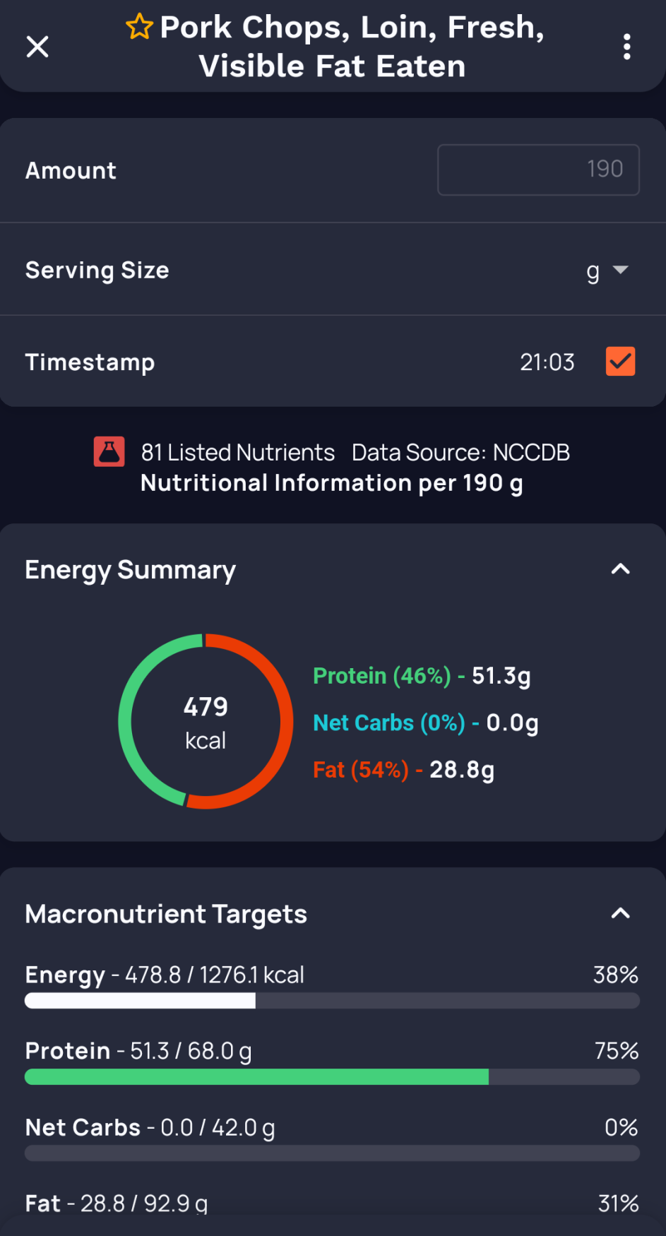 Елора, аз съм с приложение- Cronometer. То изчислява колко протеин, вгх и мазнини има в храната ми. Ето колко протеин ми изчислява от свинското: