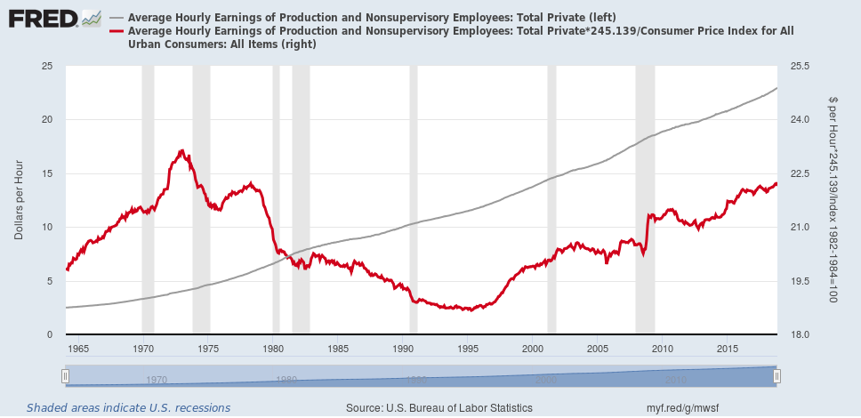 А може и реалната заработка да не се качва и даже да пада - ето как е било в Америка, сивото е номинална, червеното е реална, т.е. с отчитане на инфлацията.