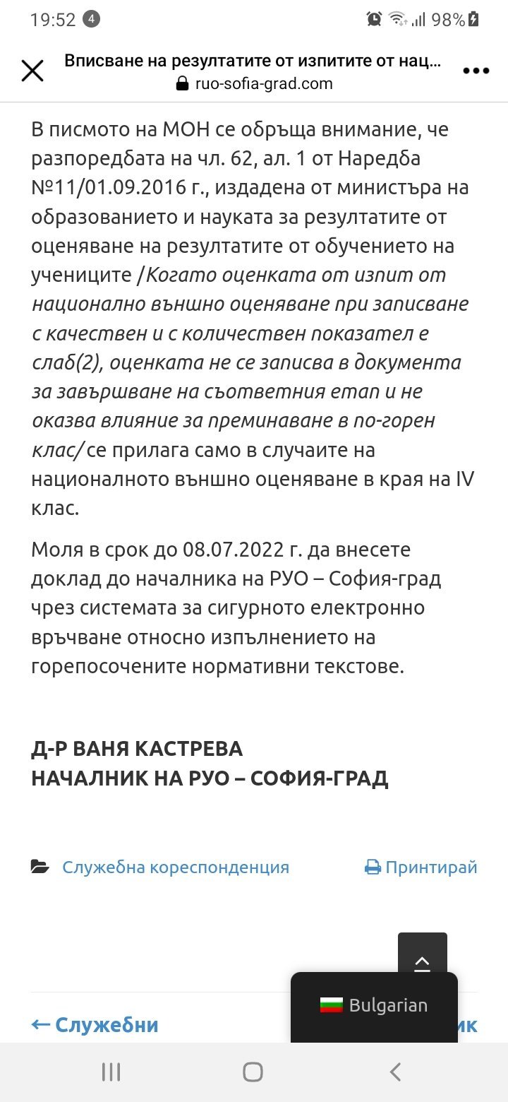 Моля в срок до 08.07.2022 г. да внесете доклад до началника на РУО – София-град чрез системата за сигурното електронно връчване относно изпълнението на горепосочените нормативни текстове.