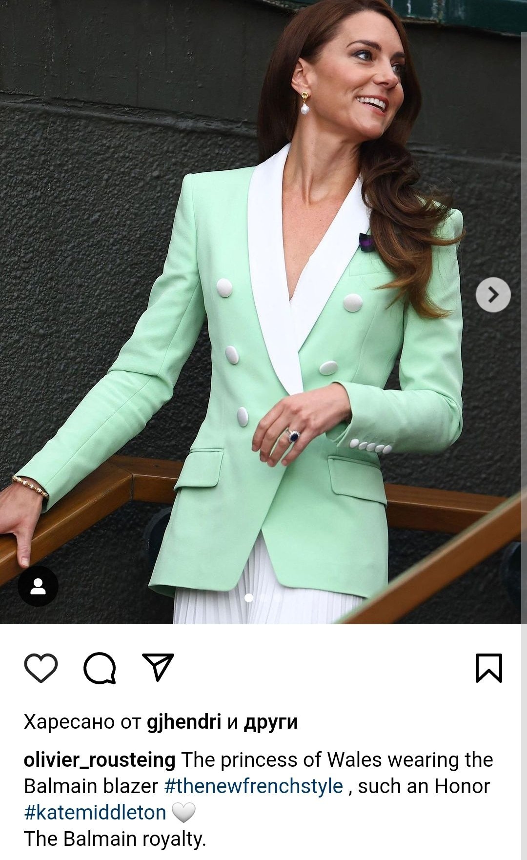 Креативният директор на френската марка Balmain с гордост споделя снимки в профила си и казва, че за него е гордост, че принцесата е избрала техен блейзър, слага хаштаг  #thenewfrenchstyle и че Кейт е Balmain royalty. Самата марка също пуска постове и сторита от онзи ден.