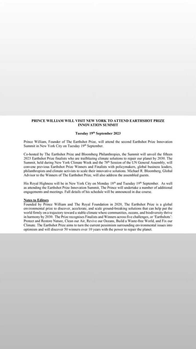 Принц Уилям ще присъства на събития свързани с иновациите за Earthshot Prize на 18 и 19 септември в Ню Йорк.