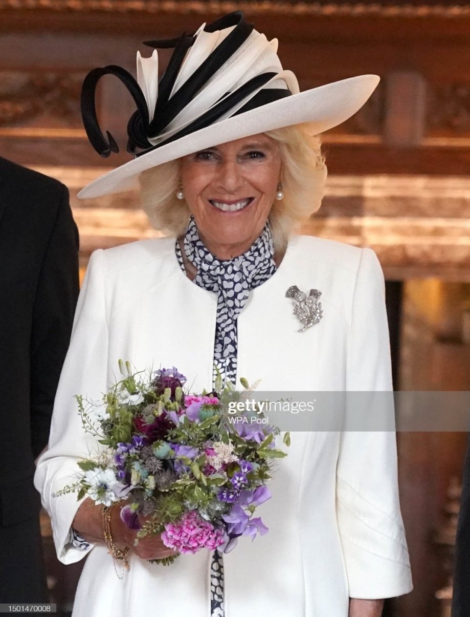 Катрин е в ментово, бяло и лилаво, много свежо.