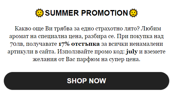 При мен код summer не работи, при вас как е? Опитвам за 10 мл Джими чу