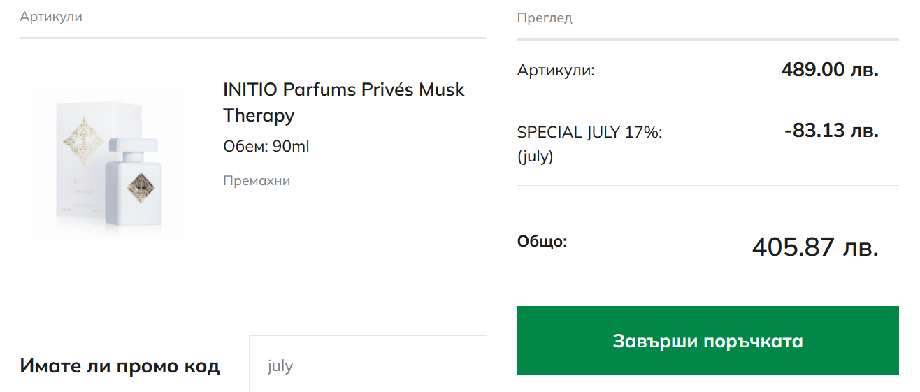 Цените на Initio в makeup.bg са доста по-добри (дори и при приложените намаления на елинор), но за съжаление няма точно този муск и поддържат по-малко аромати. Все пак си заслужават проверка периодично.