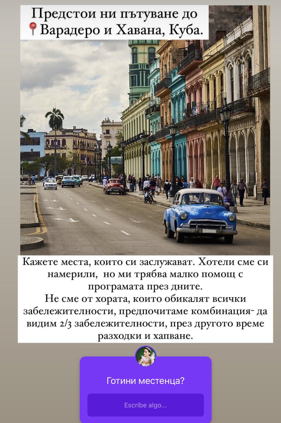 Той, средностатистическият българин, всеки уикенд лети до Куба.. Не ми изглежда искрена в молбата си.
