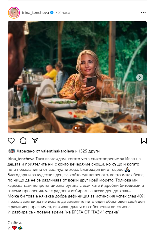 Преди няколко години Ивана и дъщеря й бяха на съседна маса в заведение. Вече беше отслабнала, с много грим, изглеждаше добре. За възрастта си според мен е супер, даже младее. Поне тогава, сега не знам как е. Дъщеря й също ми хареса нежна, без излишен грим и интервенции.