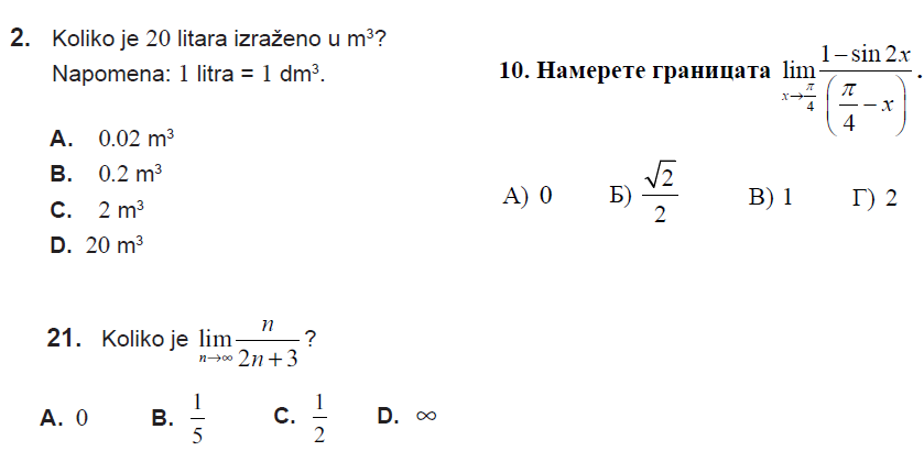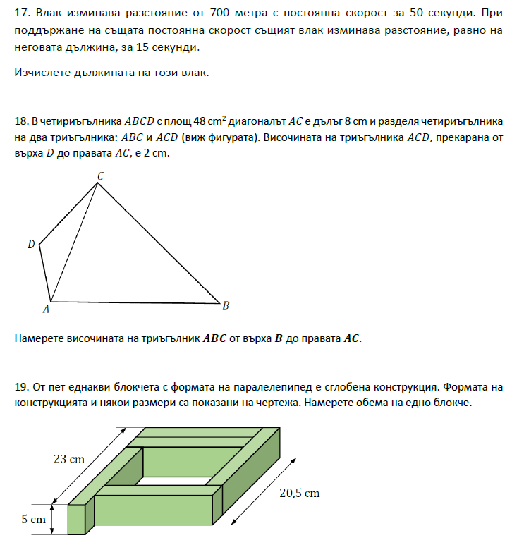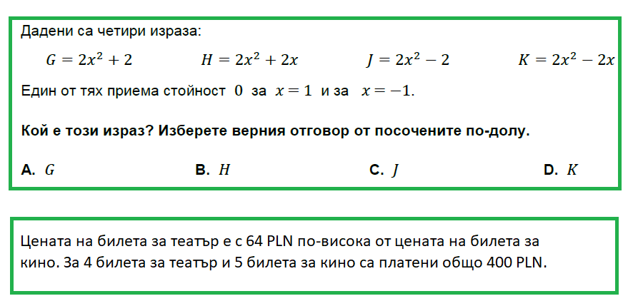 ). Та, изпитът там е след осми клас ( пак при завършване на основно образование). Не стигнах до това, дали се използва за кандидатстване. Математиката е 19 задачи, първите 15 са със структуриран отговор, а последните четири - с разширен свободен ( т. е. описателни). Времетраенето е 100 минути. Задачите на снимката са от 2023. Просто за пример.