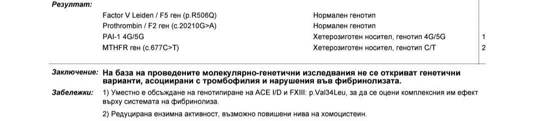 Здравейте, ще пусна и другите два фактора, но тези как ги тълкувате? Трябва ли да правя консултация с хематолог и може ли заради тази мутация да имам проблем със задържането на Б? Тепърва започвам да чета по темата, тъй като имам една нормална Б и след това извънматочна и биохимична и още не знам нищо за тромбофилията и т.н