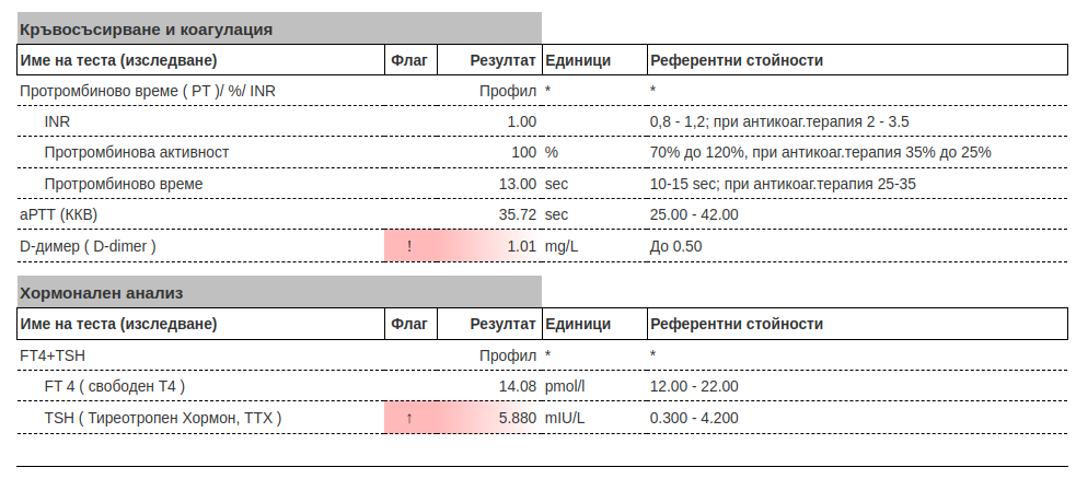 Да, ще се конуслтирам с хематолог и АГ по-късно, но по-скоро ме вълнуват aPPT и INR защото не ми говорят нищо, а гледам че има различни стойности ако си на терапия. Иначе д-димер последно беше 1.3.