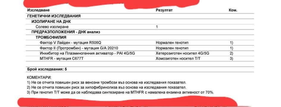 От изследванията за тромбофилия имате 2 хетерозиготни мутации по нискорискови фактори, които сами по себе си не са достатъчна причина за назначаване на терапия по време на бременността. Препоръчвам да изследвате поне още Factor 13 и ACE. След това консултация с хематолог с опит с тромбофилия.