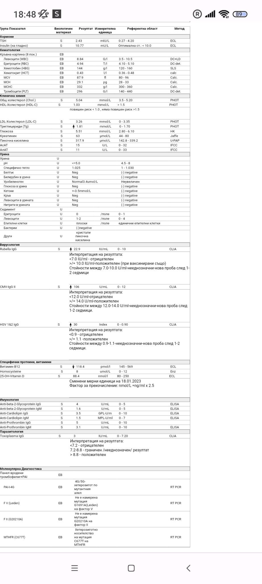 На пръв поглед виждам висок инсулин и високи триглицериди. Също ТСХ е добре да е под 2 преди забременяване, оптимално около 1. За тези неща ви трябва ендокринолог. Кръвна захар и инсулин се изследват на гладно, като предишния ден се вечеря рано, без сладко и много въглехидрати.