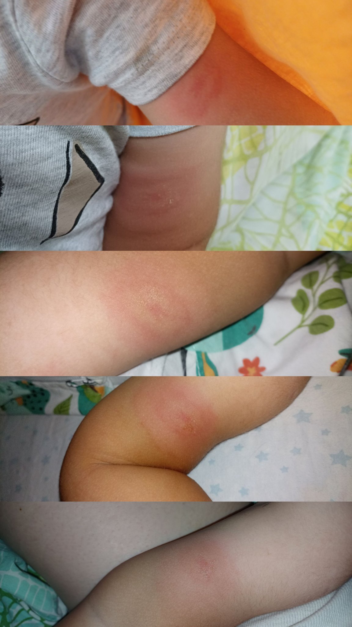 Здравейте! Това излезе  на сина ми вчера. Първата снимка е от вчера следобяд,  последната е от тази сутрин. Вчера сутринта беше като едно червено петно,  но не съм снимала.  Топло е като го пипна и го сърби. В гугъл като погледнах наподобява на обрив от лаймска болест,  но той кърлеж не е имал или поне не сме збелязали. По средата има малки пъпки, пълни с течност,  които се пукат.По-късно ще го заведа и на лекар, но съм притеснена.