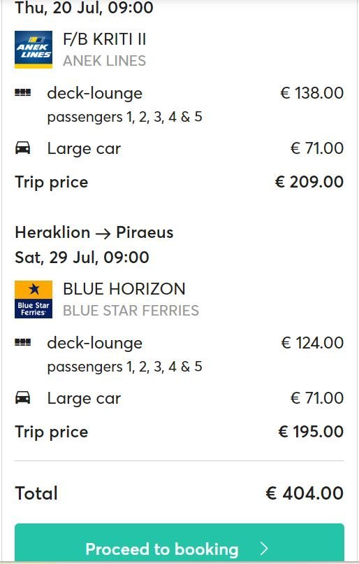 Здравейте. Поради ограничения , да не кажа вече никакъв, избор на полети до Крит, обмисляме ходенето с кола.Никога не съм купувала билети през платформа , когато сме ползвали фери, все на място , но сега не бих тръгнала без предварително да имам билети. Нещо обаче не се ориентирам. За двама възрастни с три деца и кола, правилно ли съм задала, и това ли е цената реалната? Изобщо всяка насока би била добре дошла.