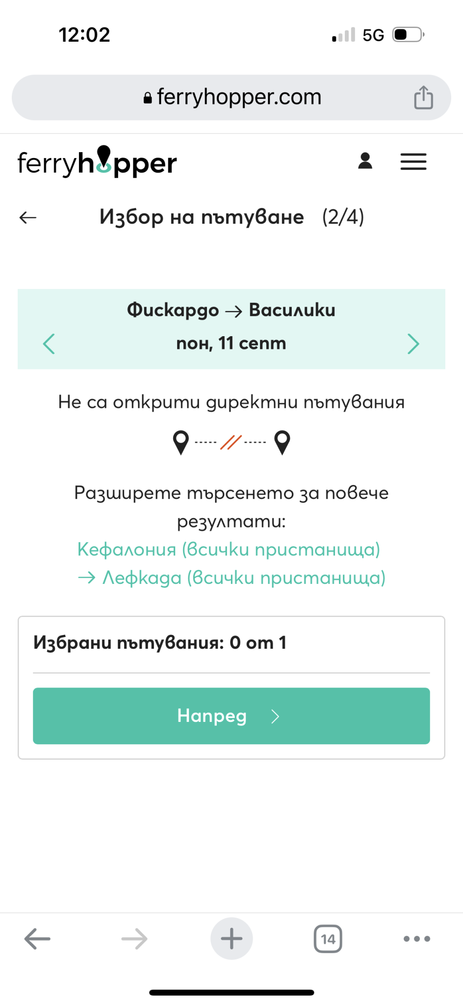 Аз ли си направих сметки без кръчмар или пропускам нещо, но опитвайки се да букна ферибот от Фискардо до Лефкада (което и да е пристанище), за дата 11.09, не намирам плавания. Последната ни нощувка от престоя ни в Кефалония я планирах да е във Фискардо, за да може сутринта на 11.09. за станем, пием кафе и да потегляме към БГ.
