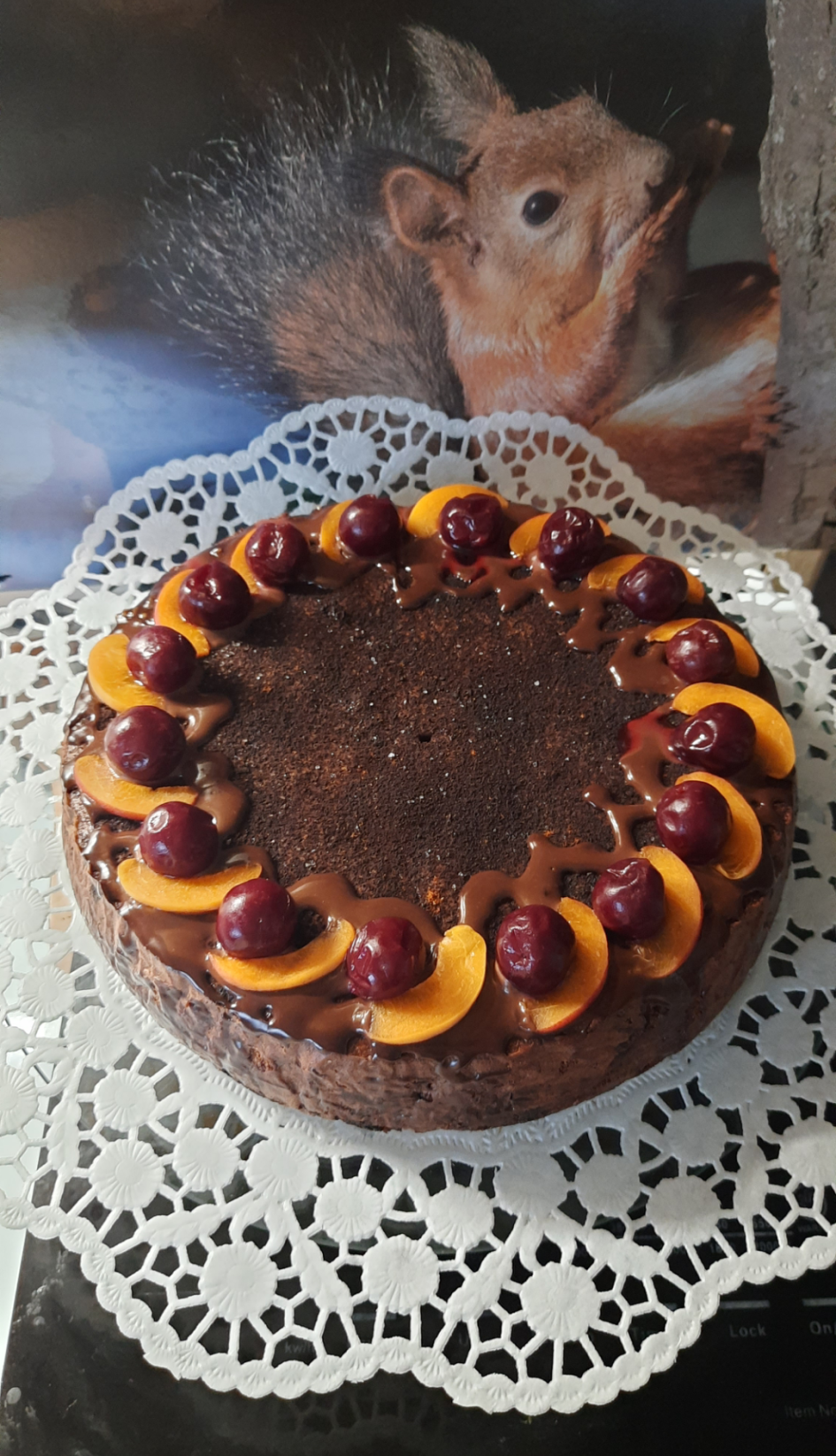 Не е стандартна торта с няколко блата и крем между тях- в средата има вишни с малко масло, какао и водата, която отпуснаха при леко задушаване. А отгоре е половината смес, запечена до 78 градуса на горния слой (за да не са сурови яйцата в него). Съжалявам само, че не се сетих да намаля градусите на фурната- щеше да е по-кремообразен горният слой. Но някой друг път...🙂 Нестандартното е, че отгоре е поръсена с какао, лют пипер и хималайска сол.😁 Не можах да се въздържа и сложих и малко от любимия ми ганаш🥰- сметана, шоколад J.D.Gross 70% с парченца карамел и капка олио (за блясък). Декорацията е от 22 грама кайсия и вишни. Не е особено сладка и най-много ми допада, че не ми се "замотава" главата, както от някои купешки накъртващи торти.