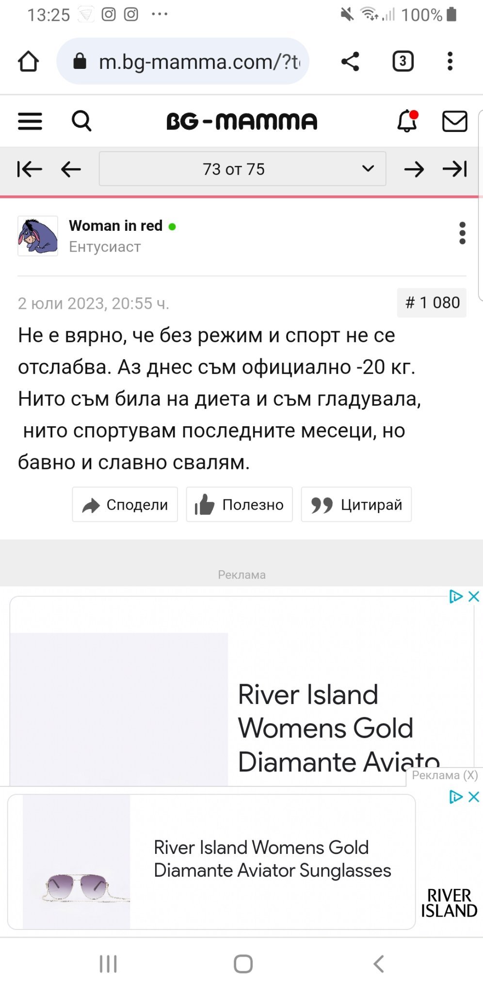 Истина е каквото съм писала. Не съм на диета. Не го считам за диета. Не броя калории и ям по малко и въглехидрати. Даже веднъж ядох шоколадова торта. И едно парче пица съм яла. Ето днес ядох една пържена чушка. За мен това не е диета, защото съм била на много такива, където ограниченията са били строги. Тези мои коментари са от месеци. Аз спортувах много до януари. Вече не спортувам. Свалям от септември. От тогава до сега много неща са се променили. Тук като писах (преди една особа да ме отказа) наистина пробвах да съм строга. Е, отказах се, но явно няма и смисъл понеже съм доволна от резултата си. В живота ми съм била в двете крайности или съм се тъпчила вечер с боклуци и съм преяждала… или съм яла примерно 3 месеца варено месо с варени броколи. А до 27 бях 50 кила но почнаха проблемите с хипофункцията и метаболизмът ми отиде на майната си. Картината е цялостна, а не в отделните детайли. Колкото до това, че бях забравила едно изследване ами човек съм и бях наистина забравила че съм изследвала инсулин преди ен на брой години защото тогава исках бебе и пусках и тогава и после бременна (имах гестационен диабет) та пусках много изследвания и съм забравила, че съм го изследвала веднъж. Е изядоха ме за това. Ще кажеш, че не сме всички хора и не забравяме. Обяснявам ти понеже виждам, че си мила и любезна. На други хора не бих се обяснявала за такива дребнави глупости. Да не говорим, че е меко казано откачено да следиш някой какво пише навсякъде за да “хванеш” нещо си за да се заядеш. Всеки сам да си прави изводите.