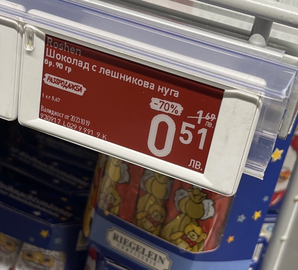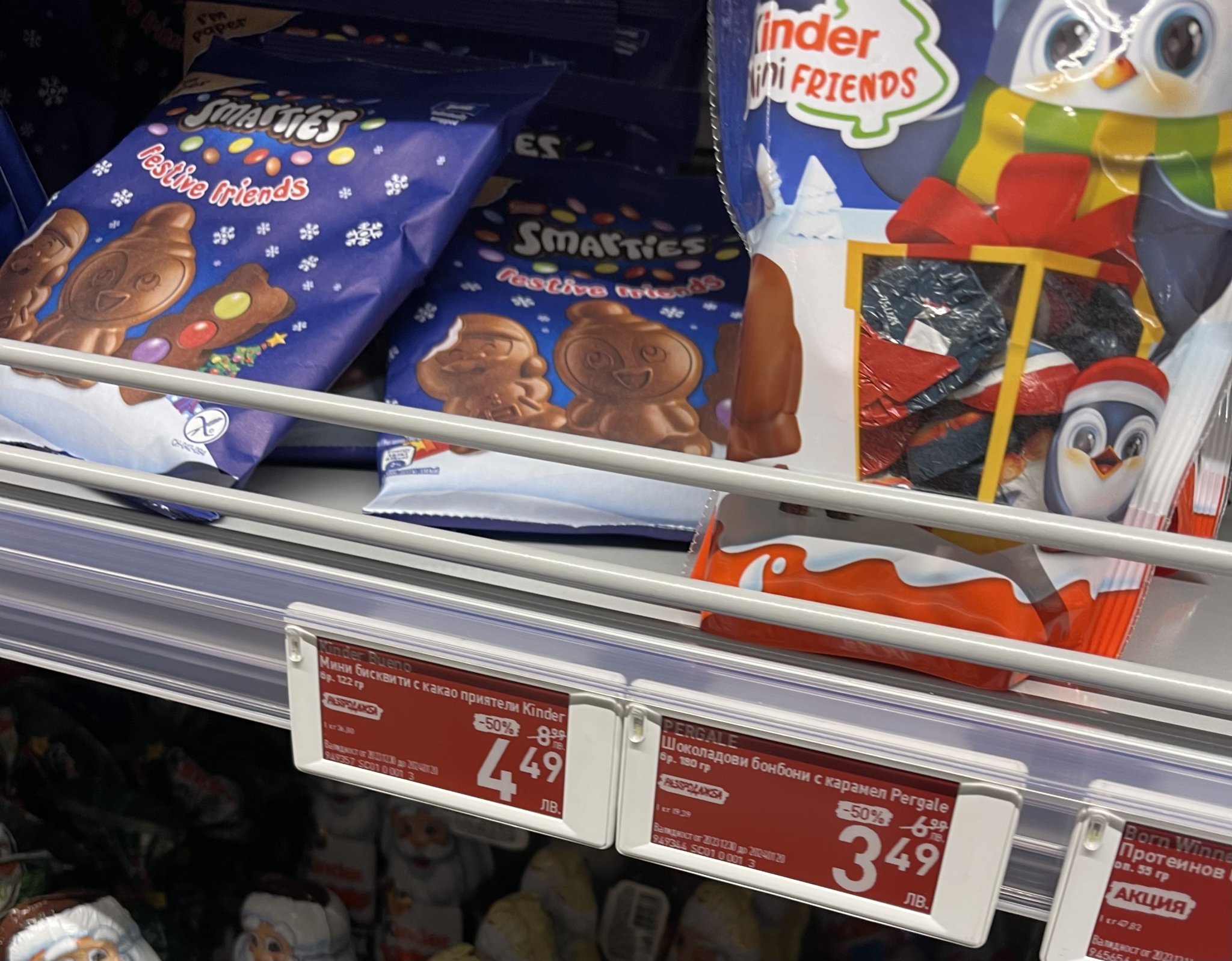 0.39лв - шоколад Rochen "Дядо Коледа" 60гр., а големия 100гр. е  1.69лв.(не е изгоден спрямо малкия) имаше и други подобни, но с 50%