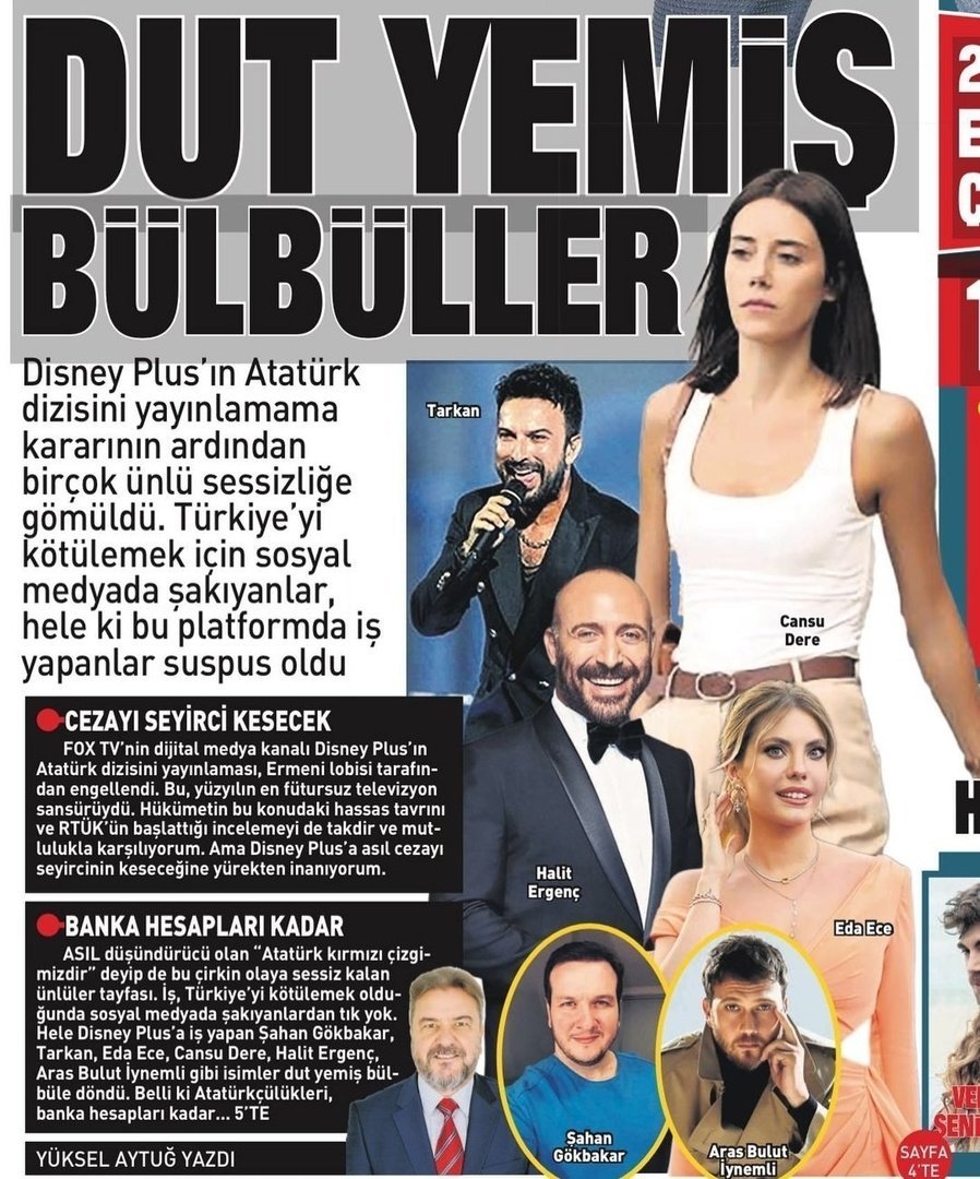 Особенно такие имена, как Шахан Гёкбакар, Таркан, Эда Эдже, Джансу Дере, Халит Эргенч, Арас Булут Ийнемли, у которых контракт с Disney Plus, превратились в соловья, съевшего шелковицу (т.е. молчат ). Очевидно, их кемализм так же важен, как и их банковские счета...