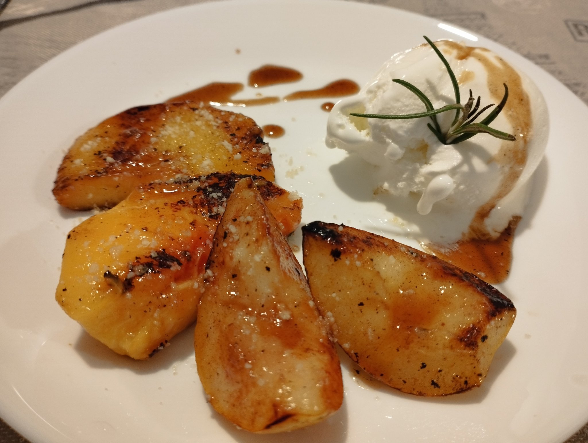 Импровизация с десерта - праскови и круши на тиган с ванилов сладолед.