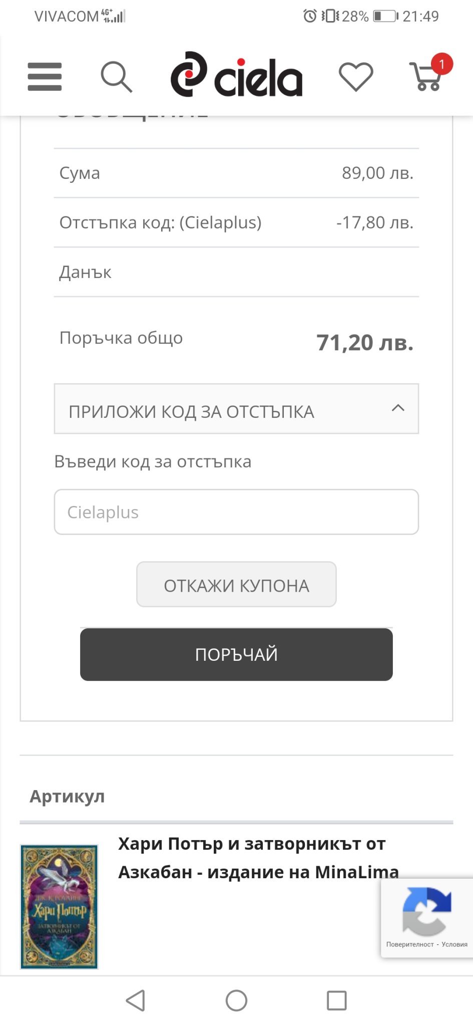 Споделям код за Сиела за 20 процента. Видях го в една фейсбук група. С него поръчах магьосническия алманах на Хари Потър
