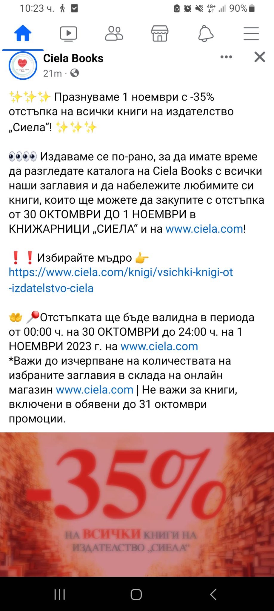 А сега де. Горе пише "книжарници Сиела и ciela.com", а долу - само сайта. Не разбрах ще важи ли за физическите книжарници.