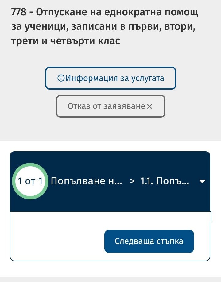 Привет! Дъщеря ми е втори клас и искам да подам документи за "Отпускане на еднократна помощ за ученици, записани в първи, втори, трети и четвърти клас" Миналата година подадох документите чрез системата за сигурно електронно връчване без проблем, но сега когато избера администрация "Агенция за социално подпомагане" в избор на услуга няма вариант „Отпускане на еднократна помощ за ученици, записани в първи, втори, трети и четвърти клас“ Някой друг с този проблем, бъркам ли нещо, защо нямам такава опция?
